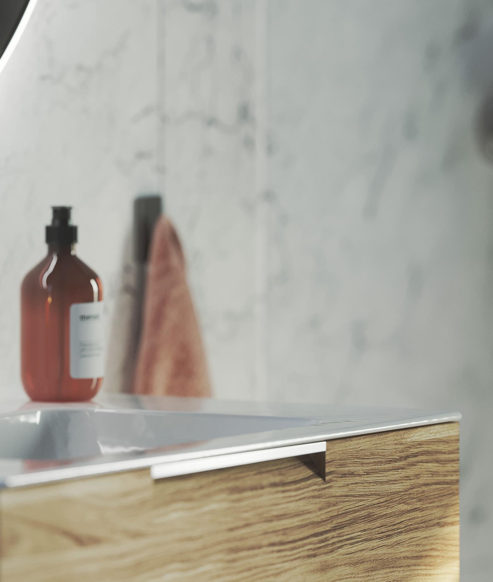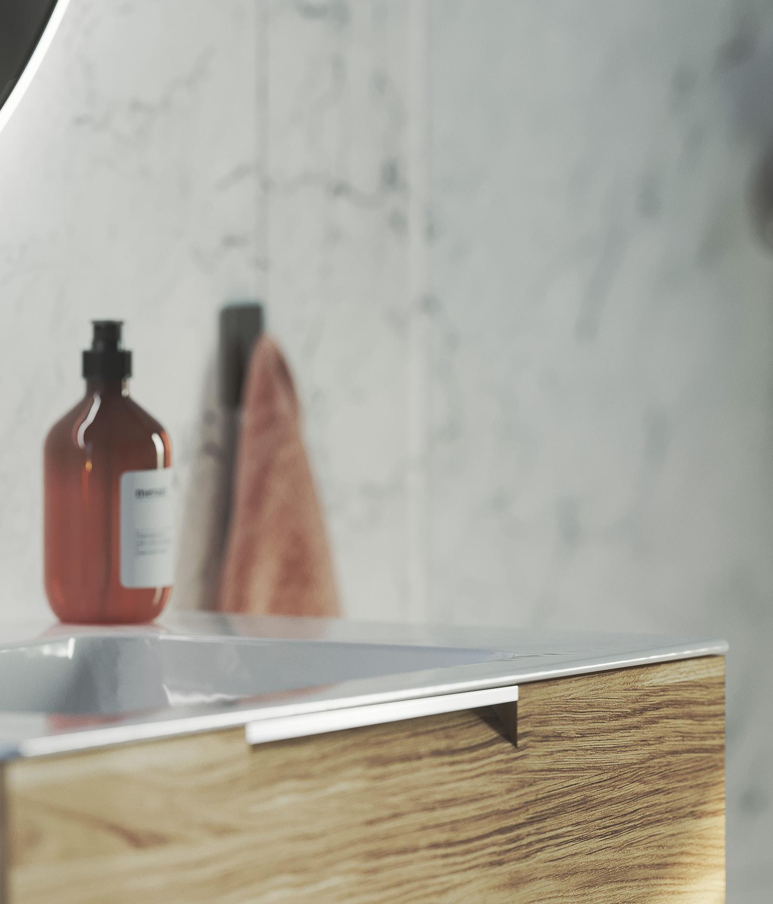 Baderomsmøbler fra Macro Design er beregnet for baderomsmiljøer og er produsert i fuktbestandige materialer som tilfredsstiller svært strenge krav til kvalitet og fuktbestandighet. Skrog, fronter og hyller er produsert av fuktbestandig tre og gjenvinnes som overflatebehandlet tre. Beslag, håndtak og skruer gjenvinnes som metall. Utsett ikke treoverflatene for direkte vannkontakt, monter ikke møbelet i tilknytning til dusj eller badekar som spruter vann på møbelet. En viss forskjell i farge kan forekomme alt etter produksjonsserie. Farger på lakkerte flater og finér kan med tiden endres i for eksempel direkte sollys. Skader som oppstår på grunn av uriktig rengjøring eller bruk og/eller langvarig eksponering med vann, gir ikke rett til reklamasjon. Vær derfor nøye med å følge våre anbefalinger for rengjøring.