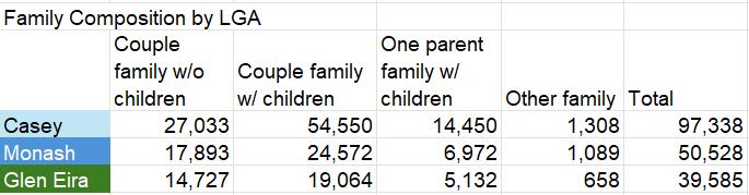 Casey contains the largest volume of families out of all 3 LGAs, especially ‘Couple families with children’ which makes up the biggest share.