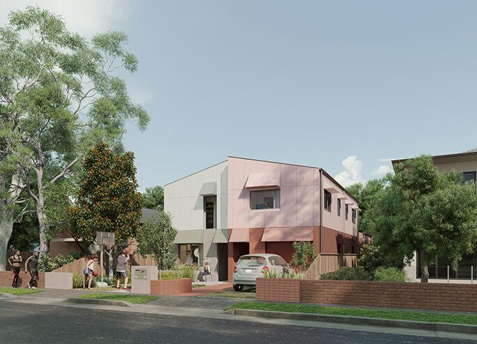 Housing designs from the NSW Housing Pattern Book have been selected as appropriate examples for medium-density development in the project area (and subsequently incorporated into the proposal drawings as placeholders) - ‘Terraces 03’ by Officer Woods Architects and ‘Semis 02’ by Sibling Architecture. These examples include design features that would help residents consume lower electricity and capture rainwater for potential reuse.