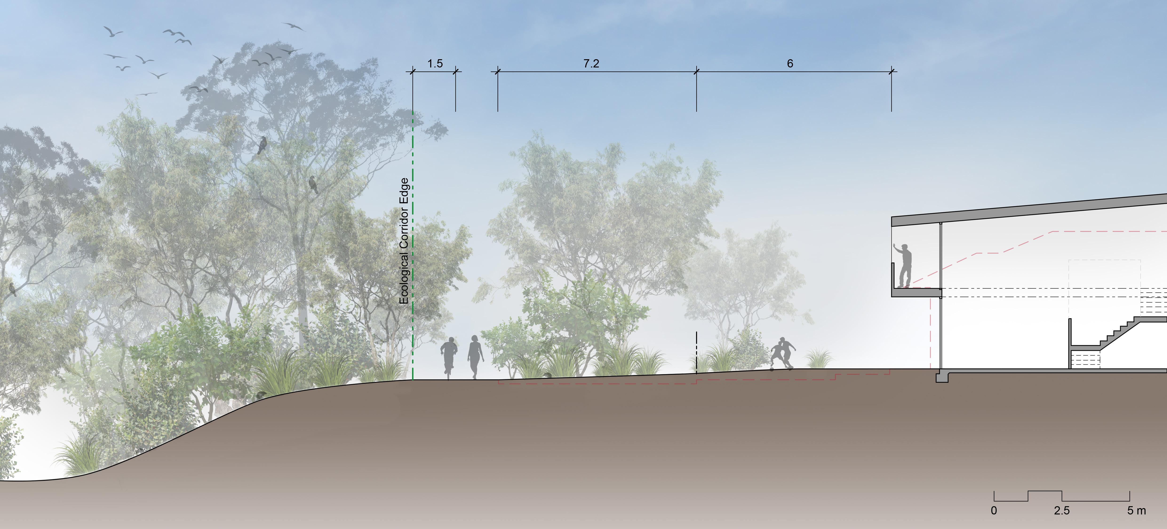 This section shows the transformed interface between housing and the ecological corridor. The existing detached housing has been replaced with terrace housing, a suitable mediumdensity typology for the existing character of the neighbourhood (buildings up to 2 storeys). Road access through Ashcombe Tce is fully removed, and replaced with native vegetation that functions as habitat for native wildlife and helps the wider area maintain a cooler temperature (important during Summer).