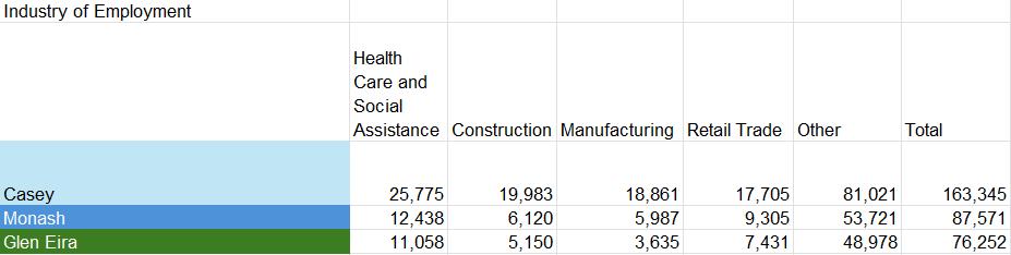 Casey’s has a more evenly spread composition of different occupations. Professionals and managers are the occupations for near half of workers in Monash and Glen Eira. The same occupations under 30% for the total in Casey.
