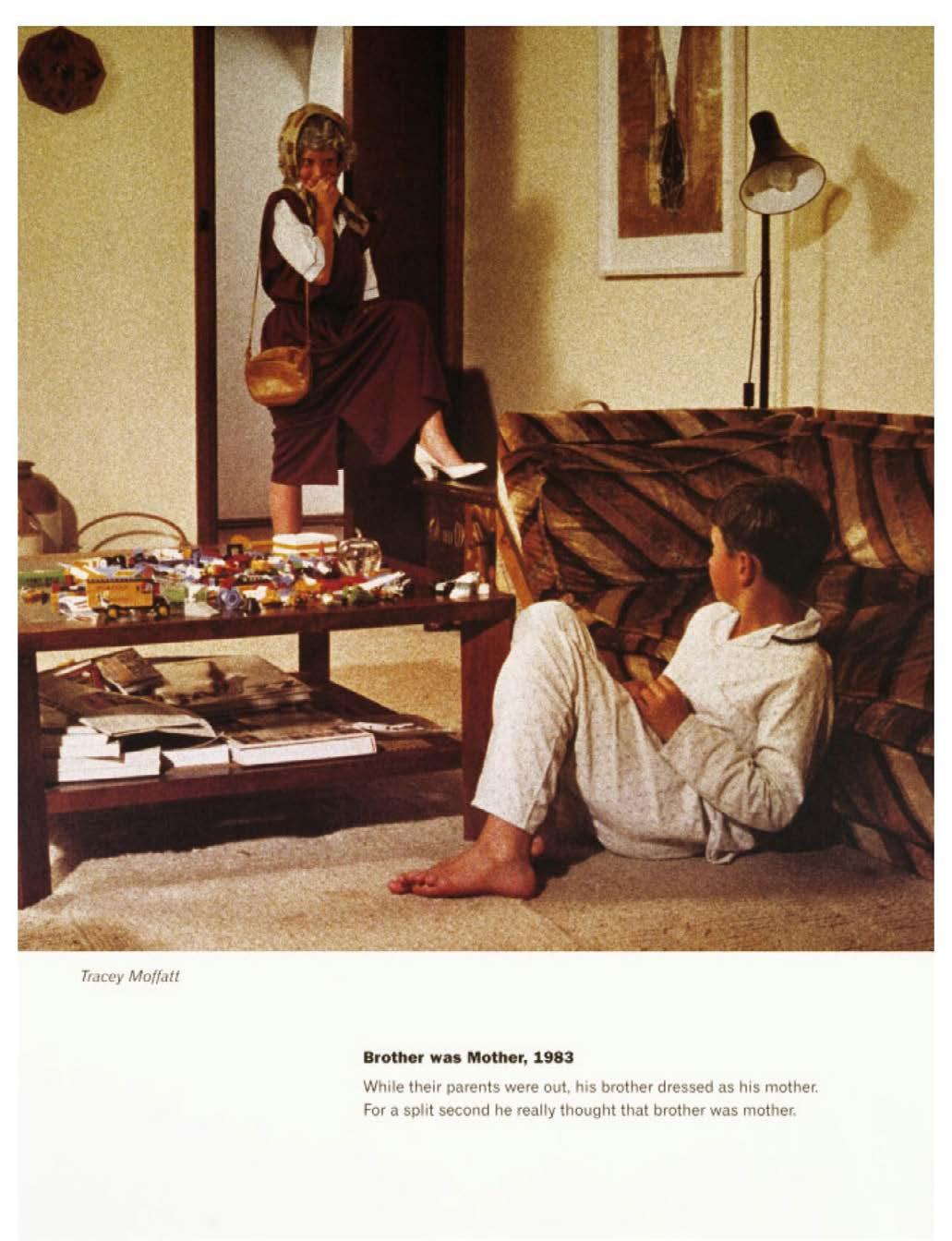 has exhibited in numerous national and international art exhibitions and film festivals for three decades. In 2012, a retrospective programme of her films was held at the Museum of Modern Art, New York. Moffatt first gained significant critical acclaim when her short film, Night Cries, was selected for official compe-tition at the 1990 Cannes Film Festival. Her first feature film, beDevil, was also selected for Cannes in 1993. Moffatt was selected for the international section of the 1997 Venice Biennale (cu-rated by Germano Celant) and has also featured in the Biennales of Sydney, Sao Paulo (1998) and Gwangju (1995). She held a major exhibition at the Dia Center for the Arts in New York in 1997-98 and in 2003, a large retrospective exhibition of her work was held at the Museum of Contempo-rary Art, Sydney which also travelled to the Hasselblad Museum in Sweden. In 2007, her photo-graphic series, Scarred For Life, was exhibited at the Guggenheim Museum and her video, LOVE, at the Brooklyn Museum in New York.