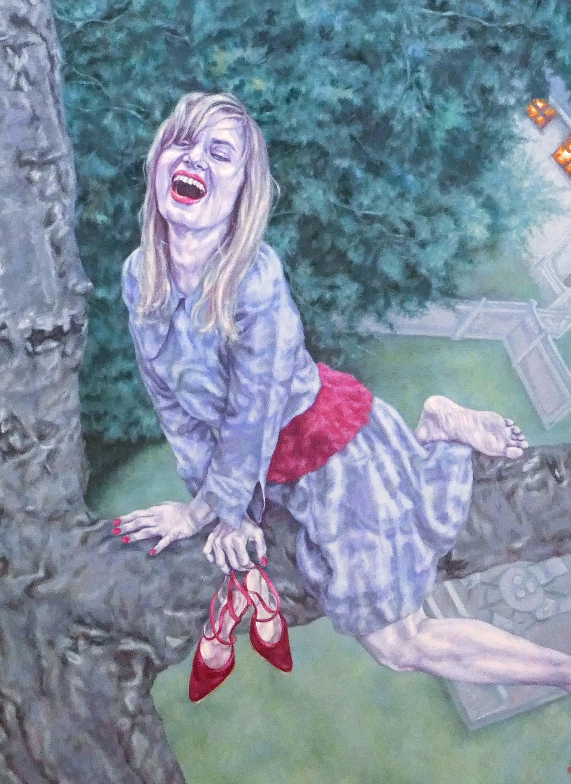 Roxana Halls is a British figurative painter who is best known for her images of women laughing while escaping from catastrophic situations, she is widely celebrated for her images of wayward women who refuse to conform to society’s expectations and for her wry humour & unsettling narratives.