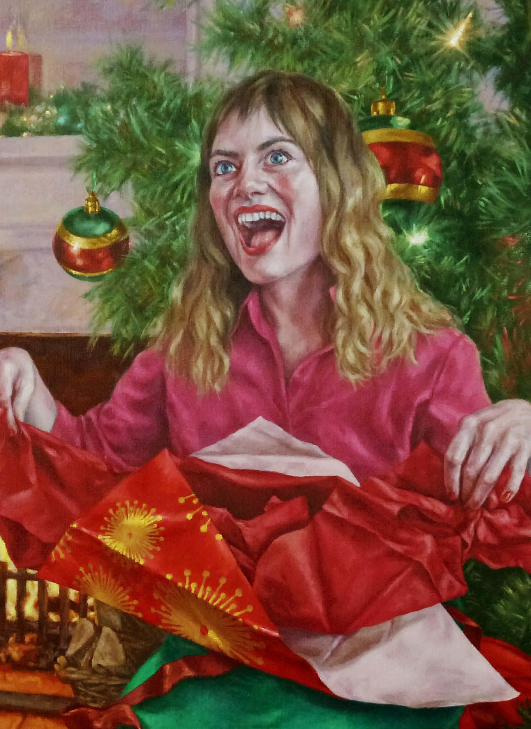 Halls’s five paintings all feature a female subject (or pair of female subjects) laughing as they engage in a certain activity. Laughing While Boating, for example, depicts the actress, Katherine Parkinson, aboard a swan pedalo on a lake outside a Butlin’s holiday camp. She sees the funny side as the outrageously long Jacobean dress she’s wearing billows over the side of the vessel, and its hemline hits the water.