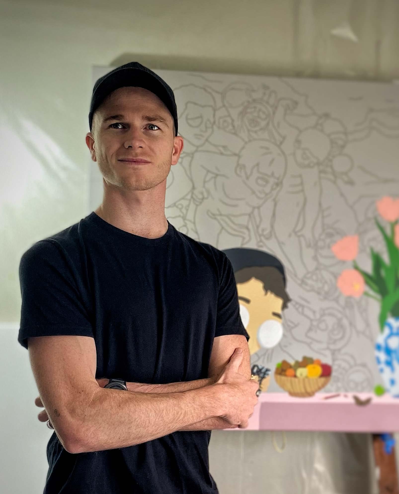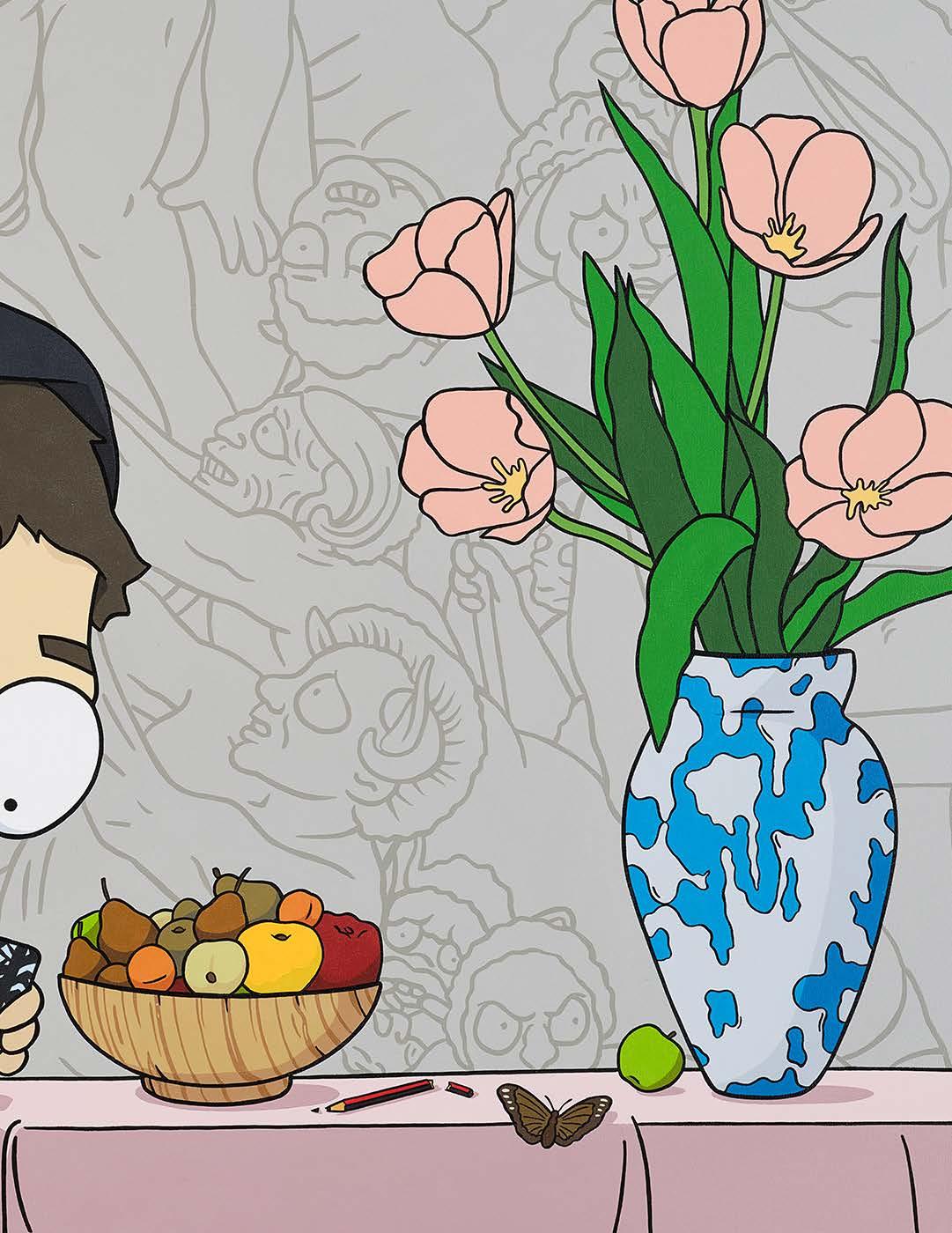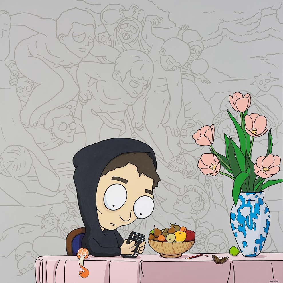 New Zealand-based artist Brad Donovan began his artistic career earlier than most, selling his drawings to other children in the primary school playground. Today, his vibrant, super-flat style and playful humour is capturing the attention of dealers, collectors, and galleries worldwide. Donovan draws inspiration from cartoons and book illustrations, but equally, the works of the old masters, resulting in a juxtaposition of traditional themes and compositions with contemporary imagery. His precisely rendered two-dimensional forms of his signature acrylic style inspire a sense of nostalgia for 1990s cartoons in viewers, providing instant and wide appeal. However, it is a closer examination of all his careful, deliberate details that reveal the artistic vision and finesse that has landed Donovan’s work in private collections and on gallery walls in recent years.