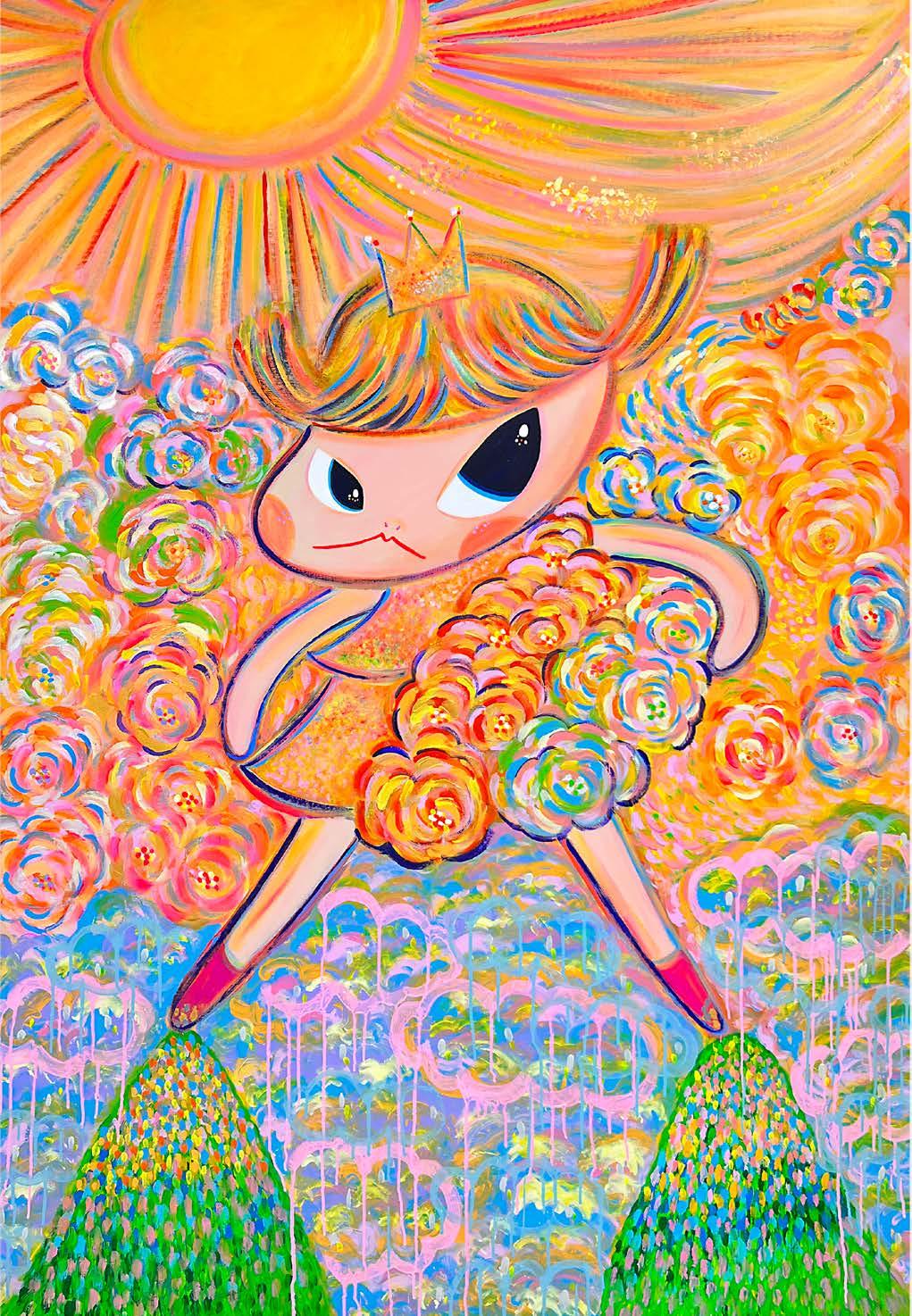 Painting primarily with her fingers to express free will and pureness, her works feature the common element of an original character who acts more like a little super girl - being brave and exploring the unknown world of fantasies in the world Lei has created for her.