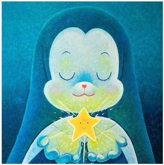 The white bear BB with curious and playful eyes, and POPO, the cute little brother blue bunny, are the characterized versions of her two children who often appear in her art works. And the honey bear symbolizes her husband.