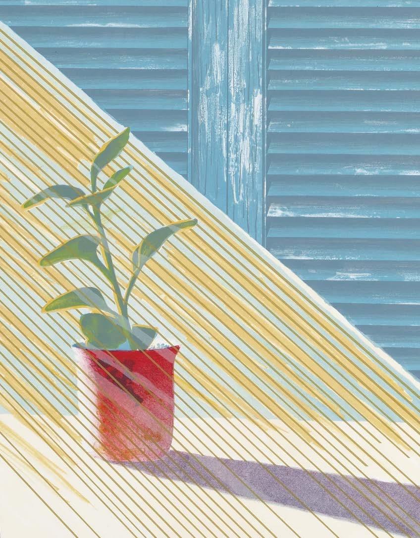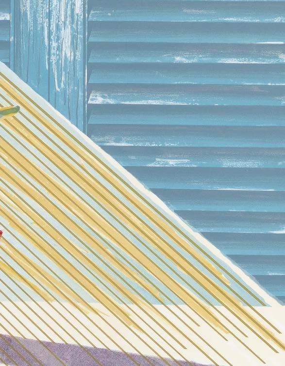 collection. Like other pop artists, Hockney approached figurative painting in a style that referenced the visual language of advertising. However, he was unique in his obsession with Cubism, combining several scenes to create a composite view, and choosing tricky spaces like split-level Californian homes which offered already-challenging depth perception. In these acrylic canvases, Hockney developed the style for which he is best known. Flat planes lay side by side, confusing any sense of distance, and shadows appear to be erased.