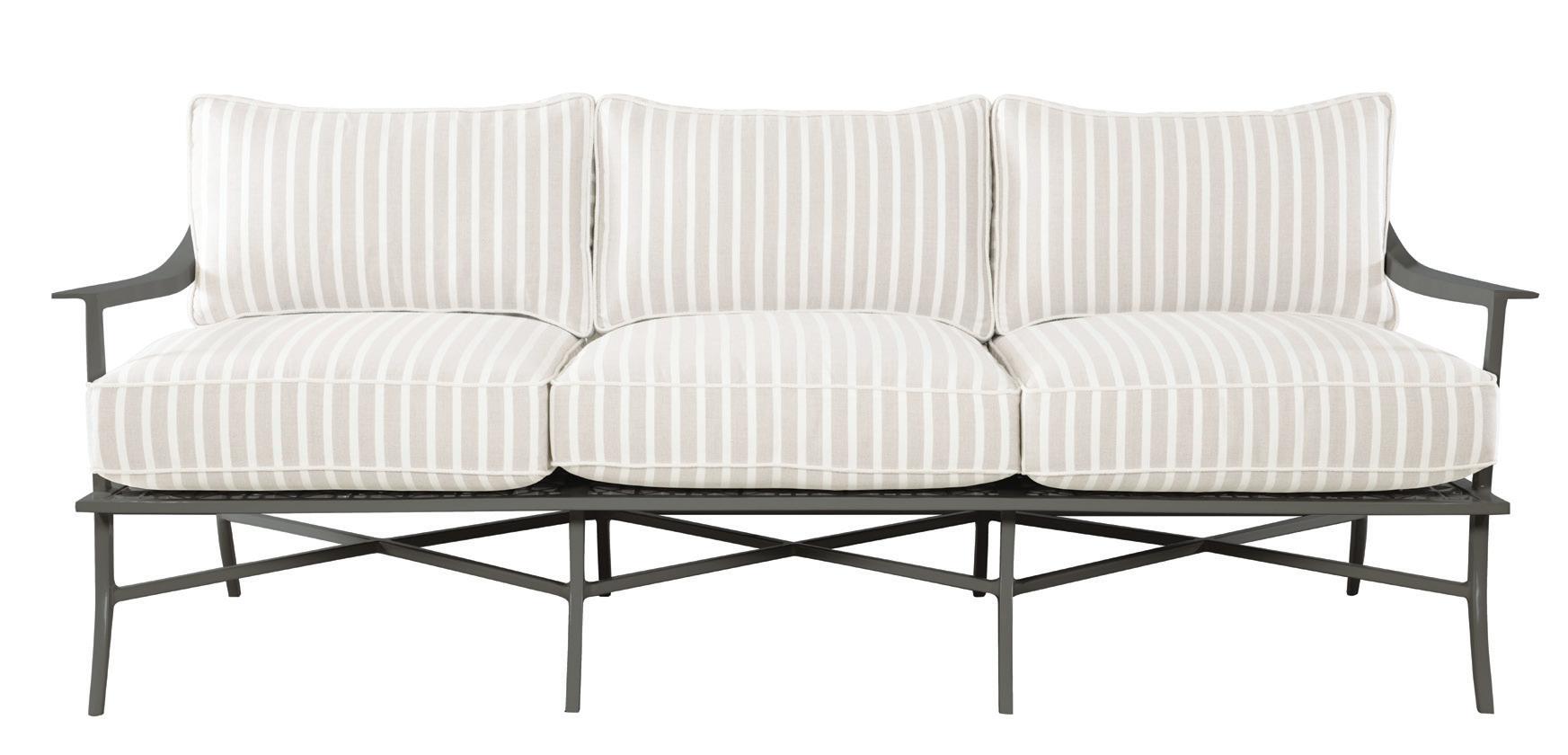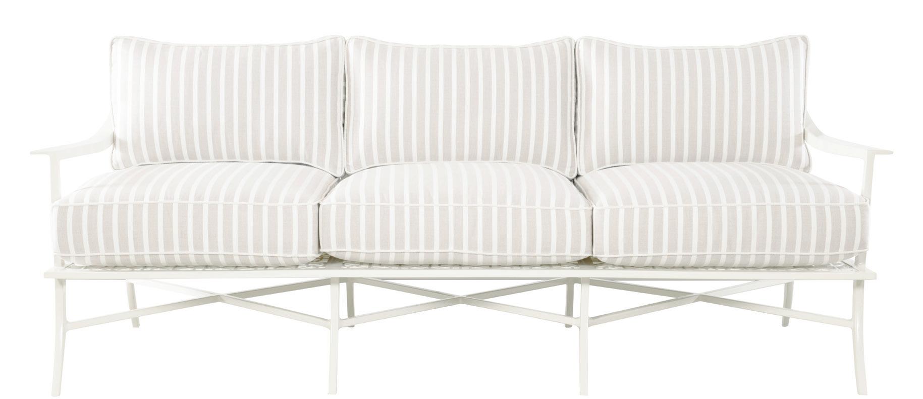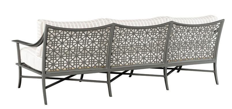 Three Blend-Down loose back cushions and three Spring-Down loose seat cushions, two 20-inch weltless throw pillows standard. Customizable skirt options available in eight skirt styles at no upcharge: Kick pleat, Pleated Corner, Box Pleat, Shirred Corner, Shirred Ruffle, Stacked Ruffle, Soft Shirred Skirt, Soft Stacked Shirred Skirt. *Shown with Dressmaker Skirt.