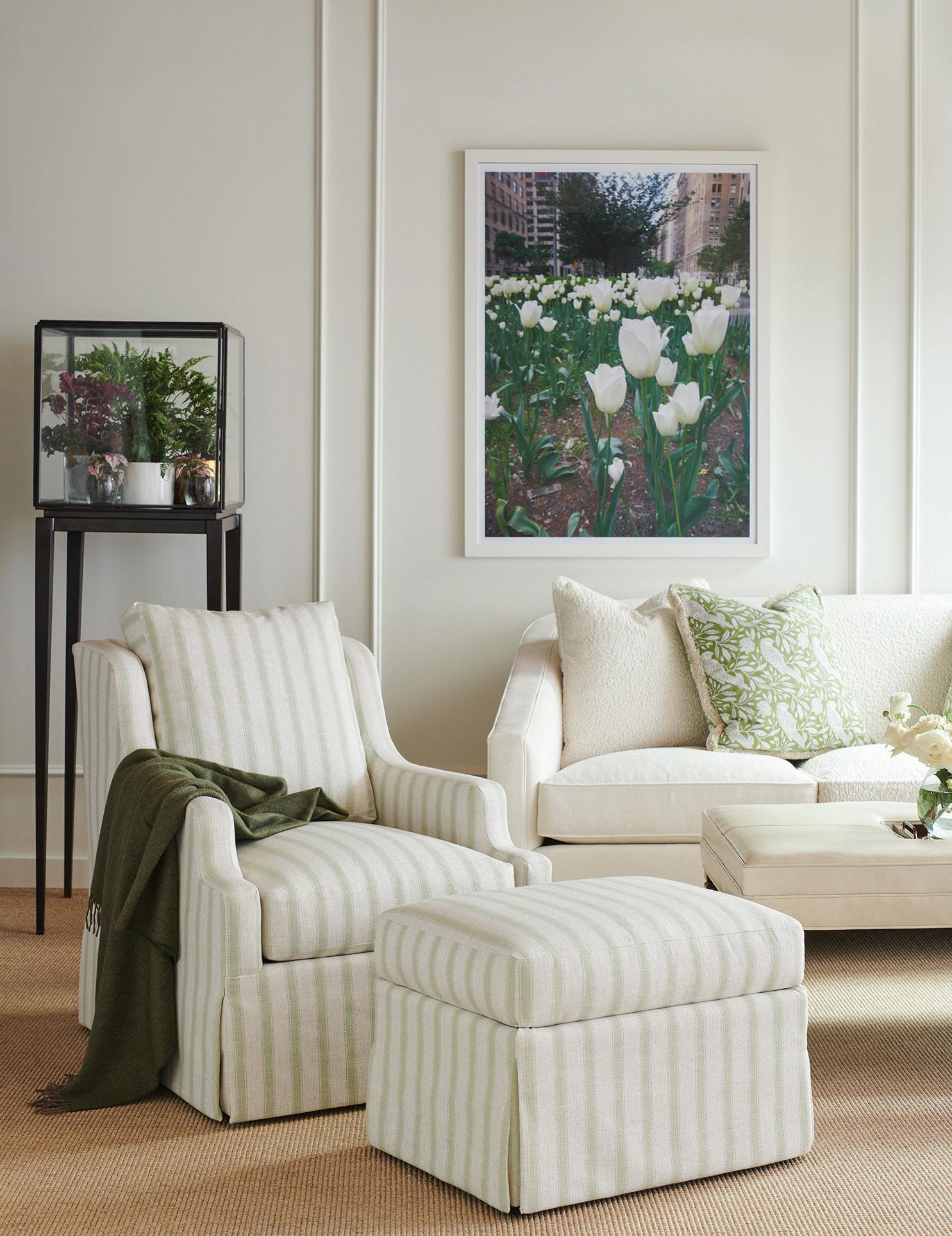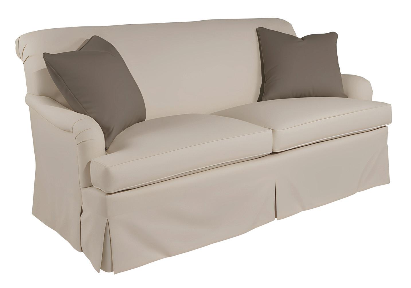 Spring-Down loose seat cushion and Blend-down loose back cushion are standard. Customizable skirt options available in eight skirt styles at no upcharge: Kick pleat, Pleated Corner, Box Pleat, Shirred Corner, Shirred Ruffle, Stacked Ruffle, Soft Shirred Skirt, Soft Stacked Shirred Skirt. *Shown with Dressmaker Skirt.