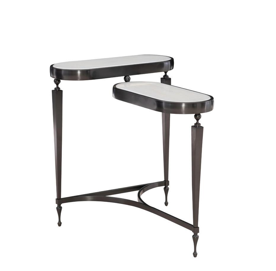 Alain Midnight Bronze metal finish and sealed honed white quartz top .