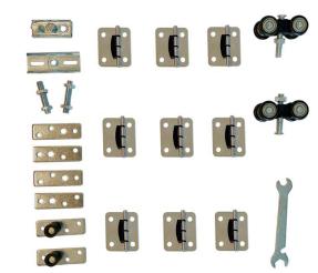 3. Instale el tope inferior y la guía superior en la parte derecha de la puerta, luego una las puertas con las bisagras, se recomienda instalar una bisagra en cada extremo de la puerta y la otra al centro, proceda a instalar la rodachina a la puerta como se muestra en la imagen.