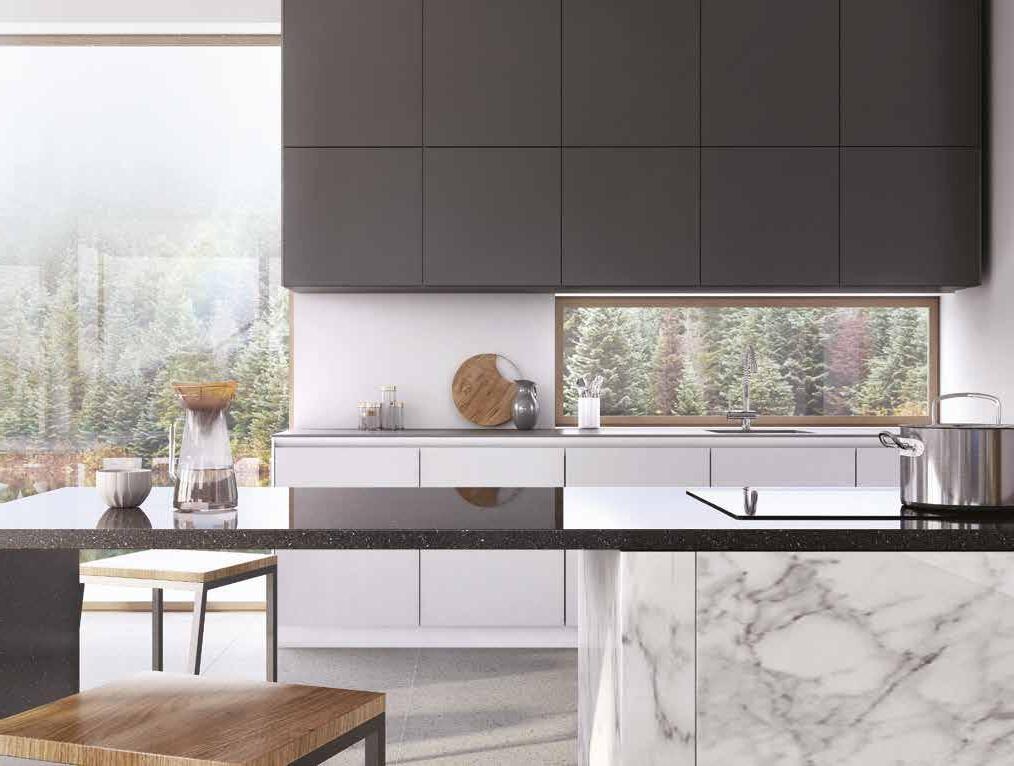 Para revestir superficies horizontales de mesadas o frentes verticales de muebles.