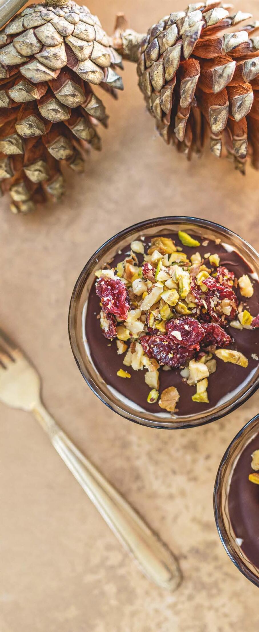 3. Spoon 2 teaspoonful of melted chocolate over each yoghurt pot and quickly sprinkle over the nut and cranberry mix.