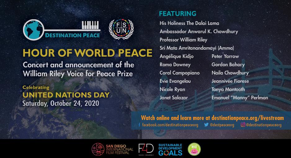 On October 24, 2020, Destination Peace and the Foundation for the Support of the United Nations premiered the Hour of World Peace Livestream for United Nations Day, featuring globally renowned figures including His Holiness the Dalai Lama, Angélique Kidjo, and Roma Downey. I was commissioned to conceptualize and execute all video graphics for the event, including intro and outro sequences and animated title slides.