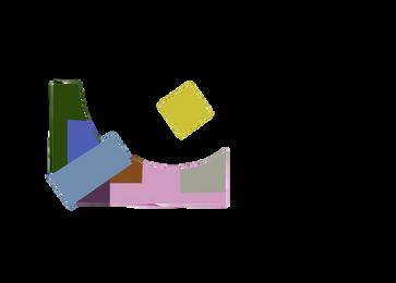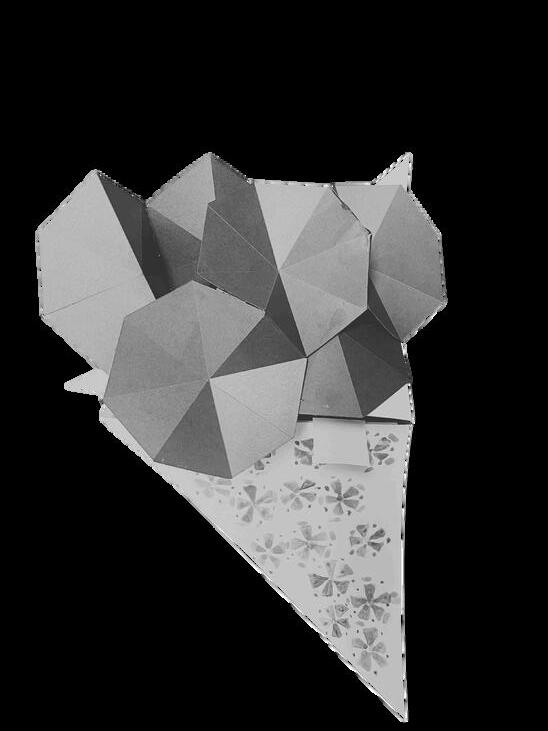 surroundings while moving through transitional spaces. Using aggregate forms within a set space, this installation piece—part of a group project—aimed to create a partial blockage, forcing awareness within a small space. The project utilized Rhino and Grasshopper digitally and was realized with chipboard and spray paint.