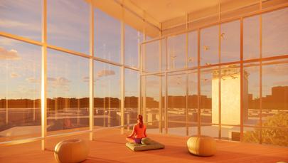 Wood louvers and glass surfaces establish a natural atmosphere with filtered light and visual connections to the outdoors Despite urban constraints, the design prioritizes green space through a minimal footprint The layout transitions from vibrant community areas to quiet private zones, supporting the center's community-building mission.