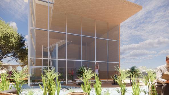 The Tybee Sports Medicine Retreat is a sequential campus extending from Butternbean Beach into the natural marsh The journey begins with residential living, flows through classroom spaces and a gym, and culminates in a circular meditation room suspended over the marsh with a central opening to observe the ecosystem below