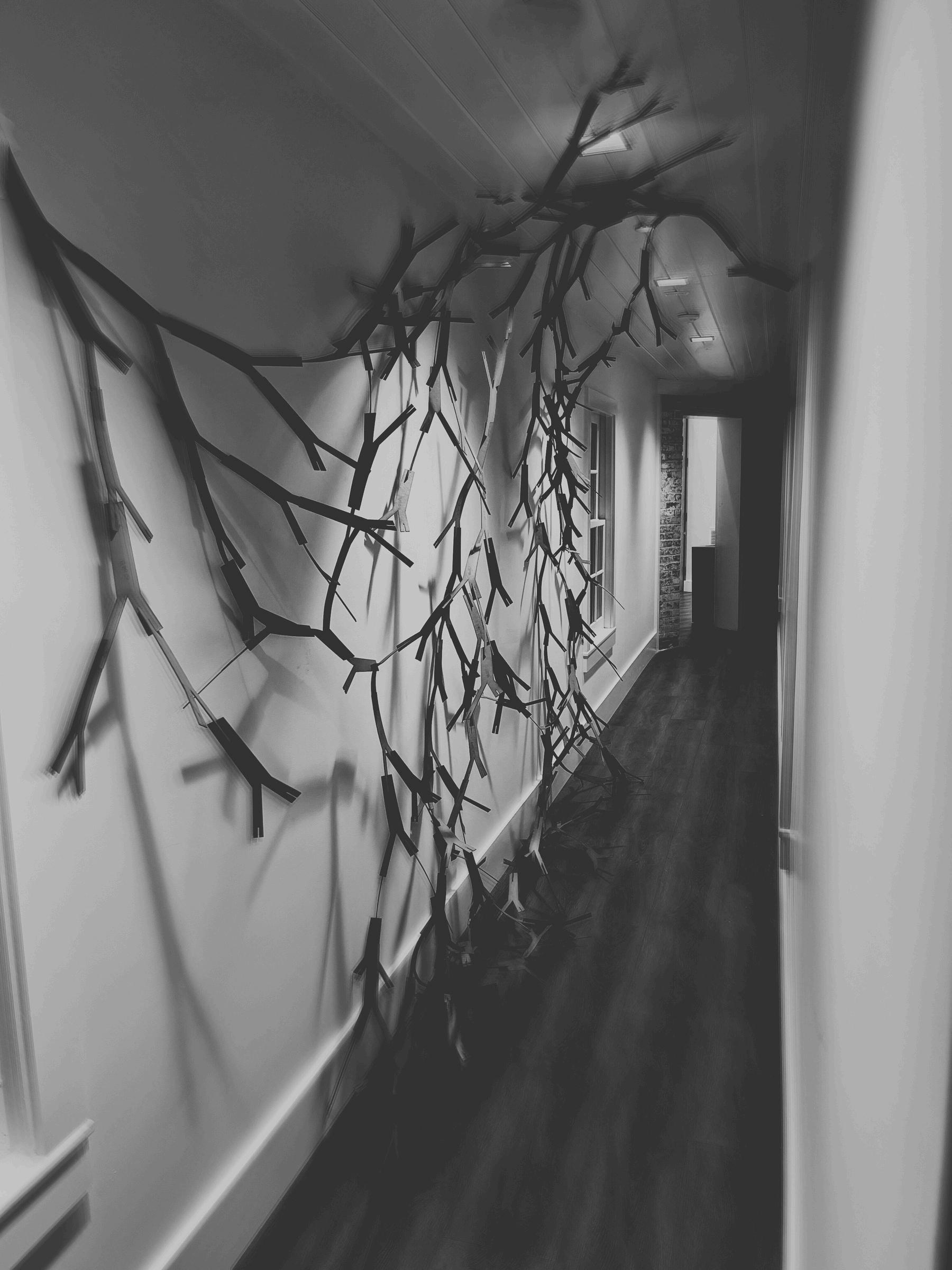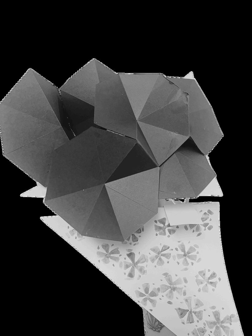 surroundings while moving through transitional spaces. Using aggregate forms within a set space, this installation piece—part of a group project—aimed to create a partial blockage, forcing awareness within a small space. The project utilized Rhino and Grasshopper digitally and was realized with chipboard and spray paint.