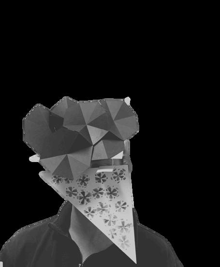 structure addresses multiple comfort factors: blue flower forms provide targeted solar protection while preserving visibility, light shelves redirect diffused daylight during Carmel's characteristic foggy periods, and carefully positioned openings channel natural air movement across the face. This experimental prototype explores the potential for small-scale, bodycentered climate adaptation, demonstrating how passive design principles can be applied at the most intimate human scale