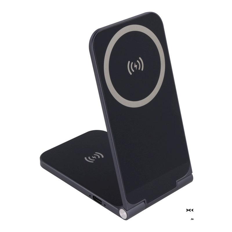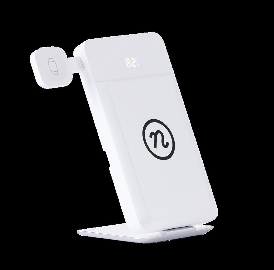 Foldable 3-in-1 Fast Wireless Charger provides three charging surfaces, offering outputs of up to 15 watts, 3 watts, and 5 watts. Compatible devices such as smartphones, Apple® Watches, Apple® AirPods.