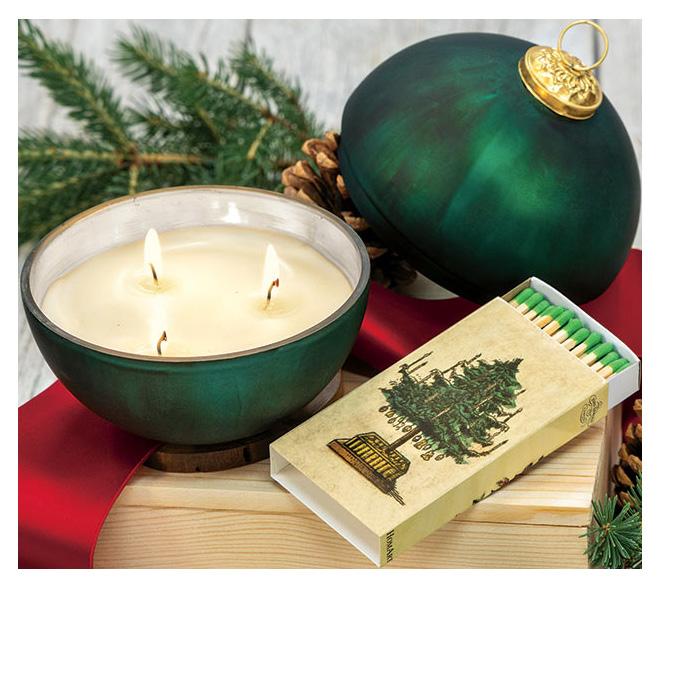 An elegant emerald ornament hides a fragrant, illuminating surprise. Filled with a fir scented 3-wick candle, our oversized ornament is chic whether displayed open or closed.