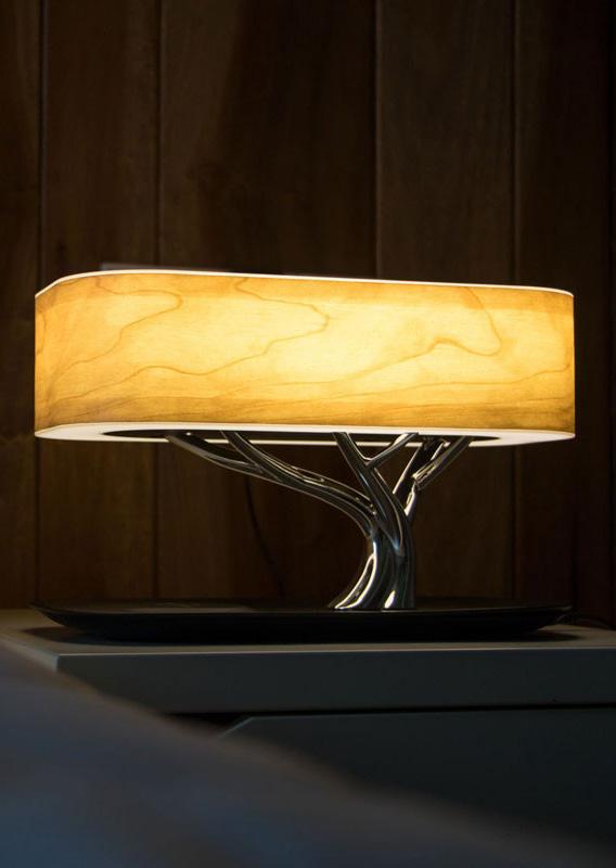 It’s a wireless charger and speaker that is not only useful but an elegant lamp as well. It’s a modern design with a natural wood lampshade inspired by the bonsai tree.