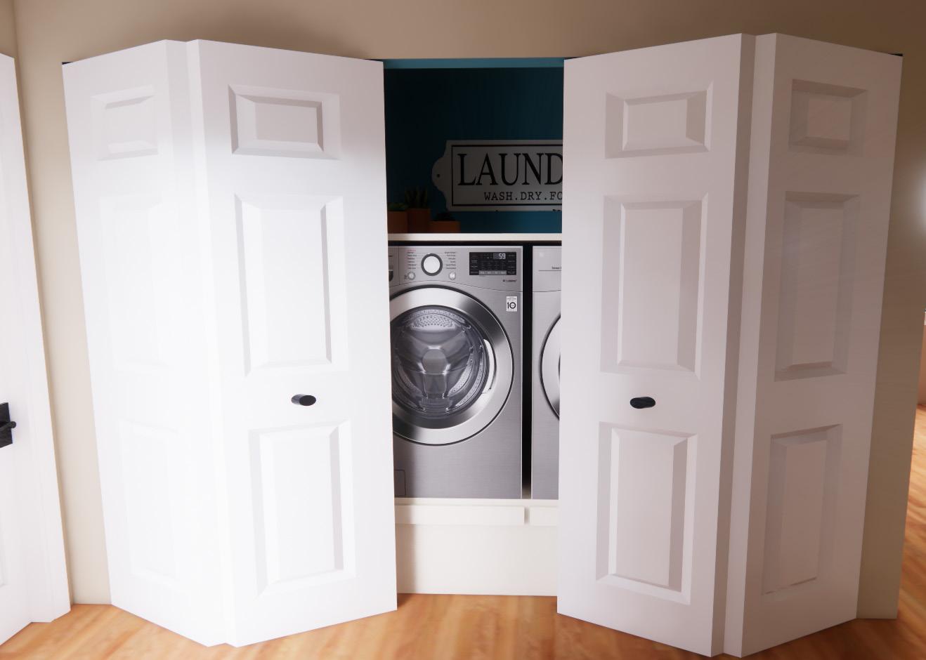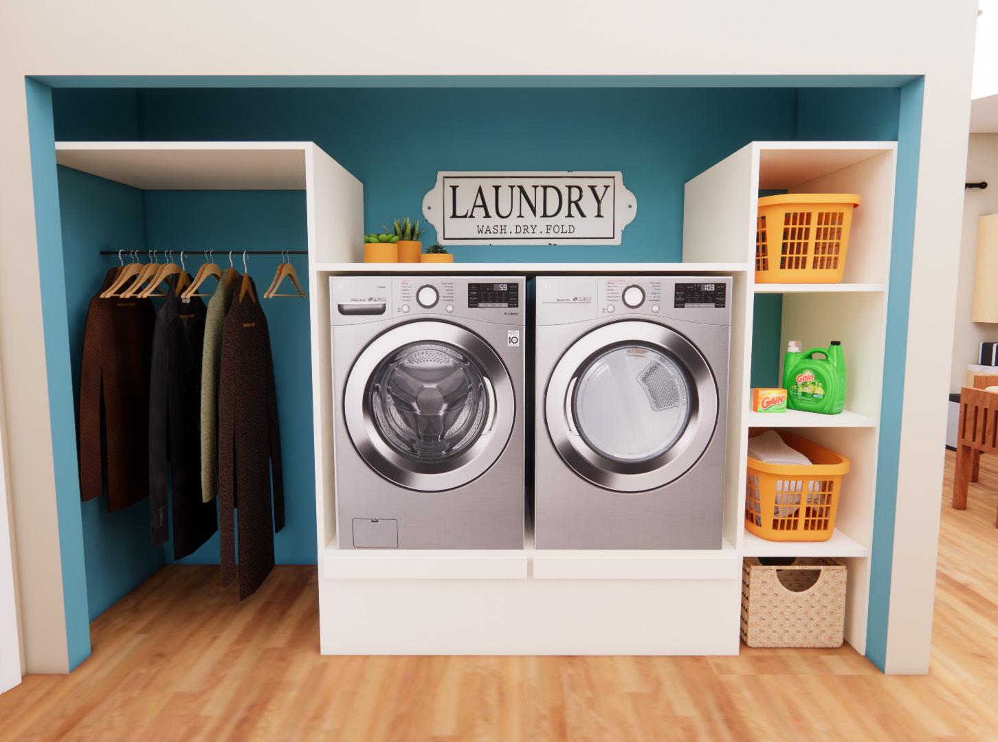 The laundry area consists of a raised washer and dryer to prevent having to bend over along with a spring loaded shelf that can be pulled out to set a laundry basket on to load or unload the machines.