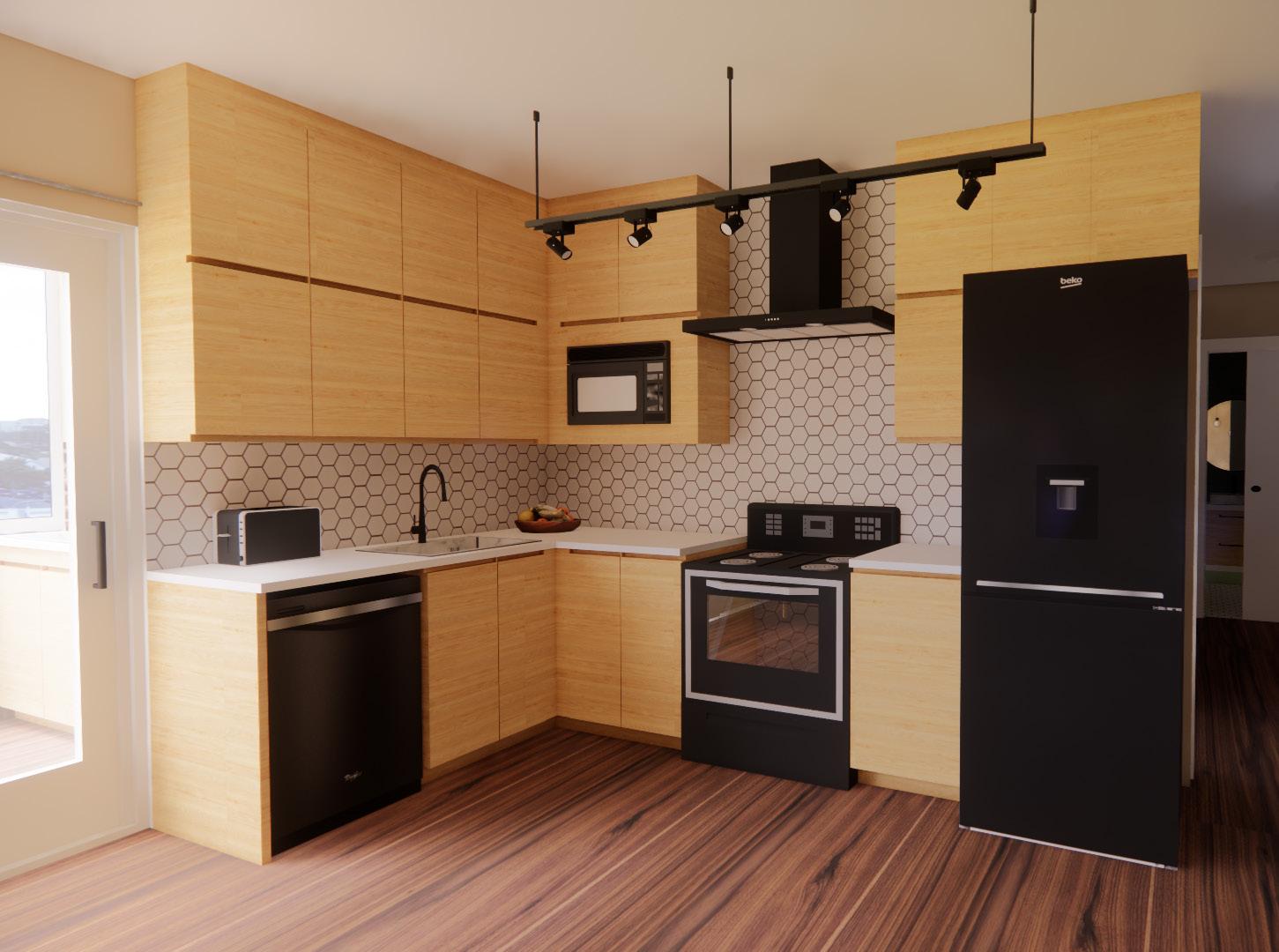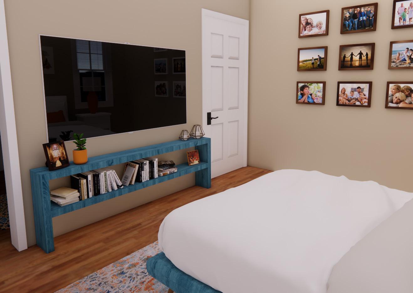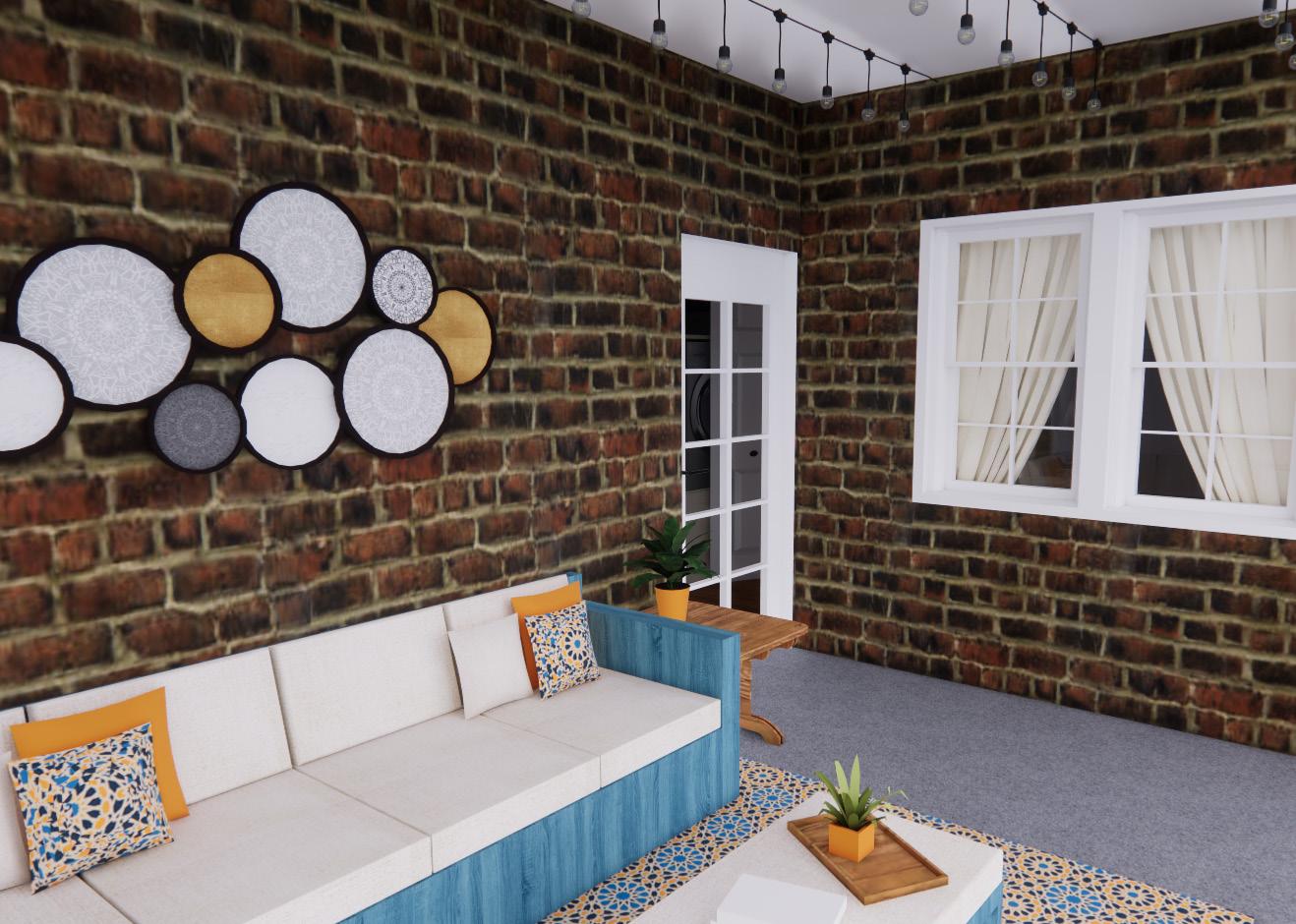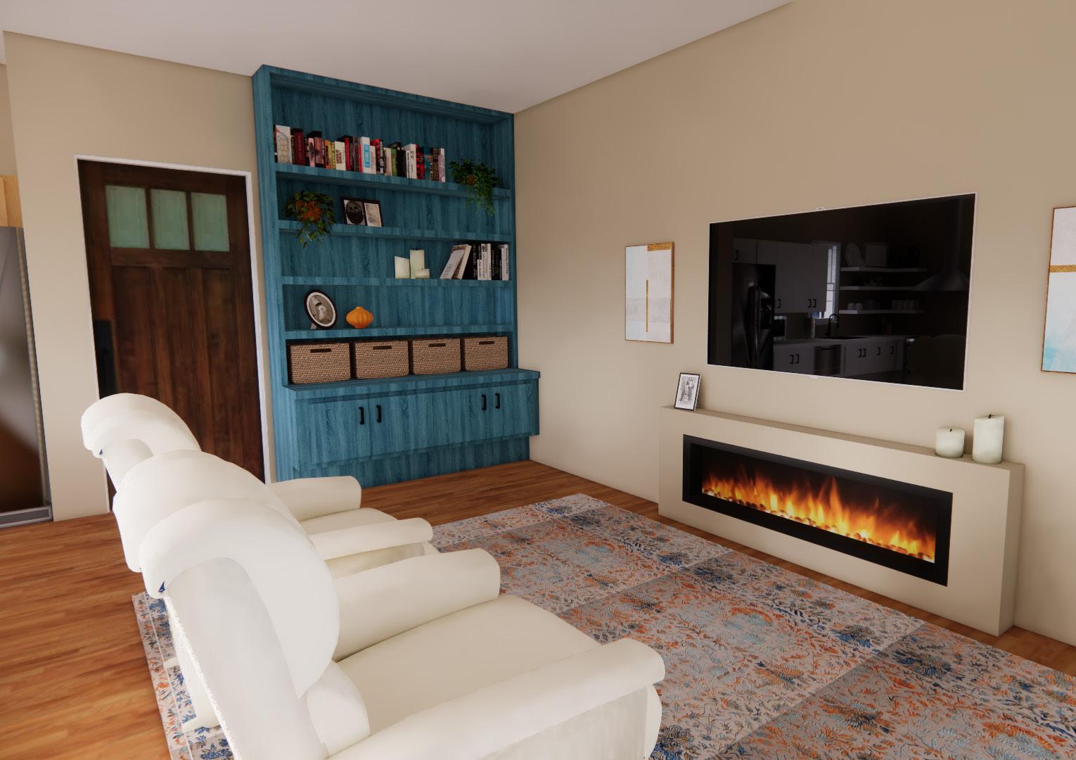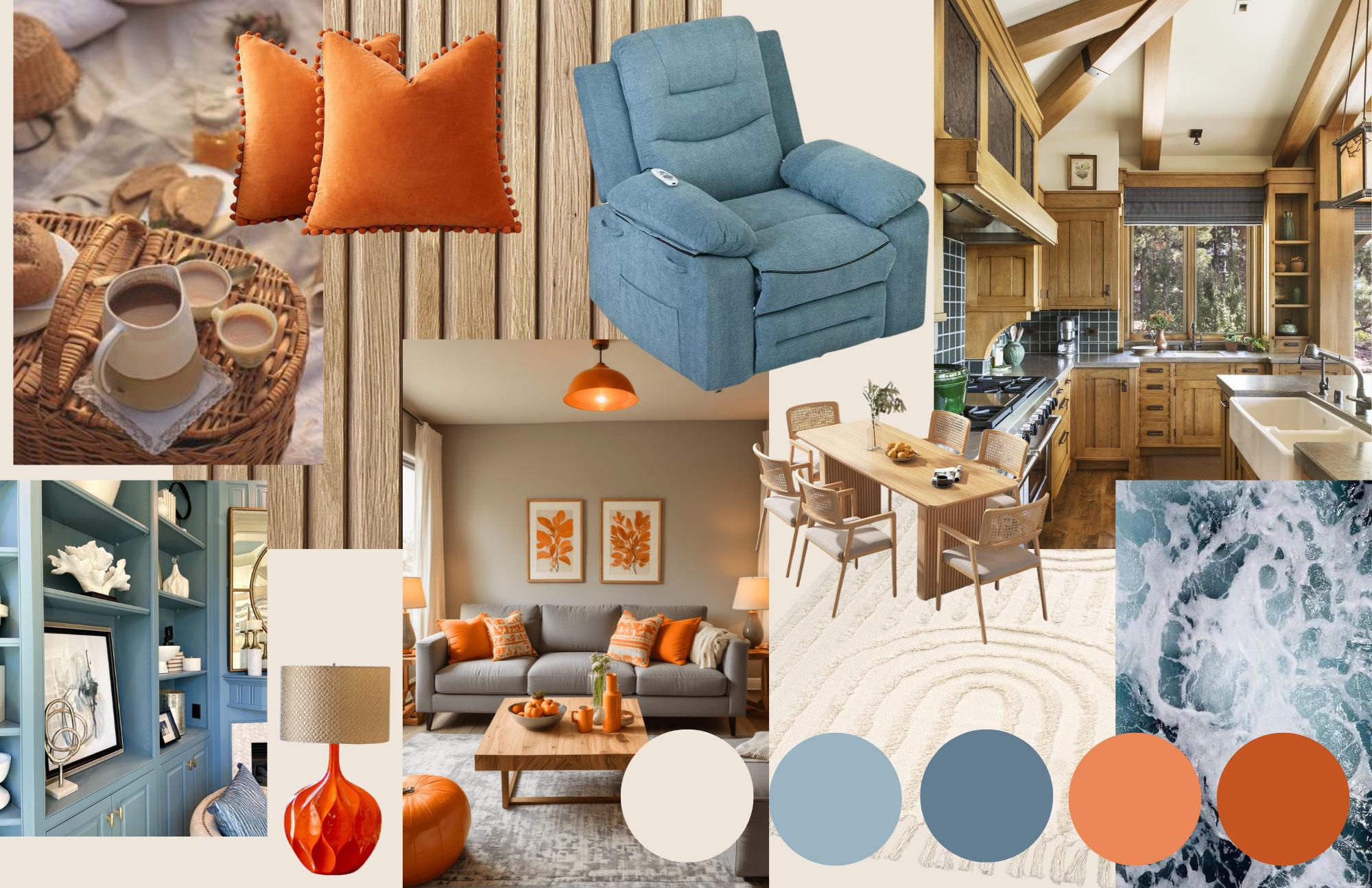 This design is intended to provide a functional and comfortable living experience for people over the age of fifty-five with aging in place, inclusive design, and ADA accessible features such as easy to reach storage, non-slip flooring materials, natural light, comfortable furniture, and an open floor plan. A coastal color pallet including shades of blue, orange, and tan create a calming feel in the space due to its contrast. It also relates the space to the outdoors to implement nature bonding. The design is simplistic and minimalistic to prevent an overwhelming state for the occupant and because of the familiarity of simplicity due to the generational time frame of the clients. All the features create a cozy feeling in the space due to contrasts in colors and materials such as wood slats and granite counter tops, organic shapes in furniture, and soft textiles on furniture.