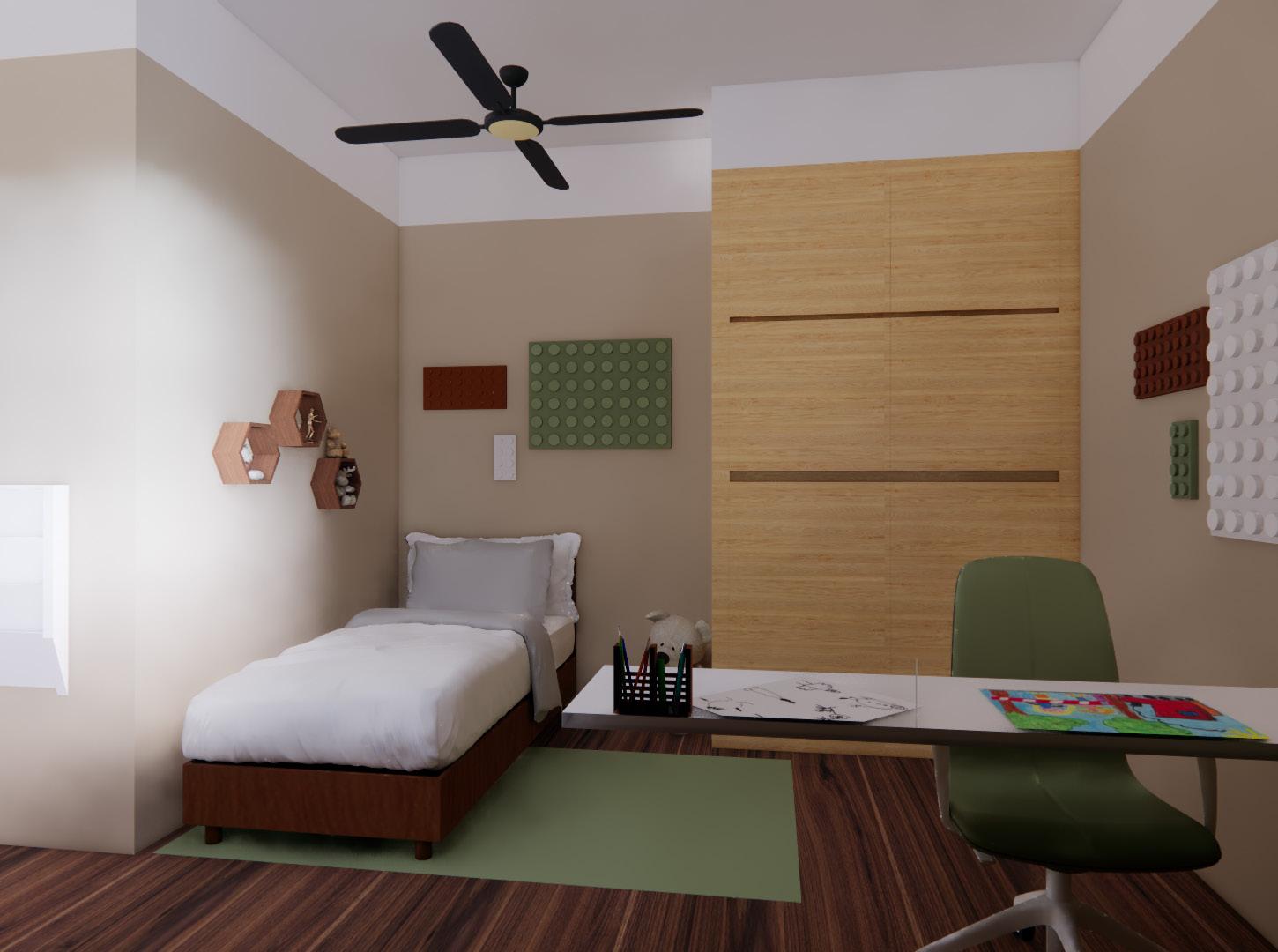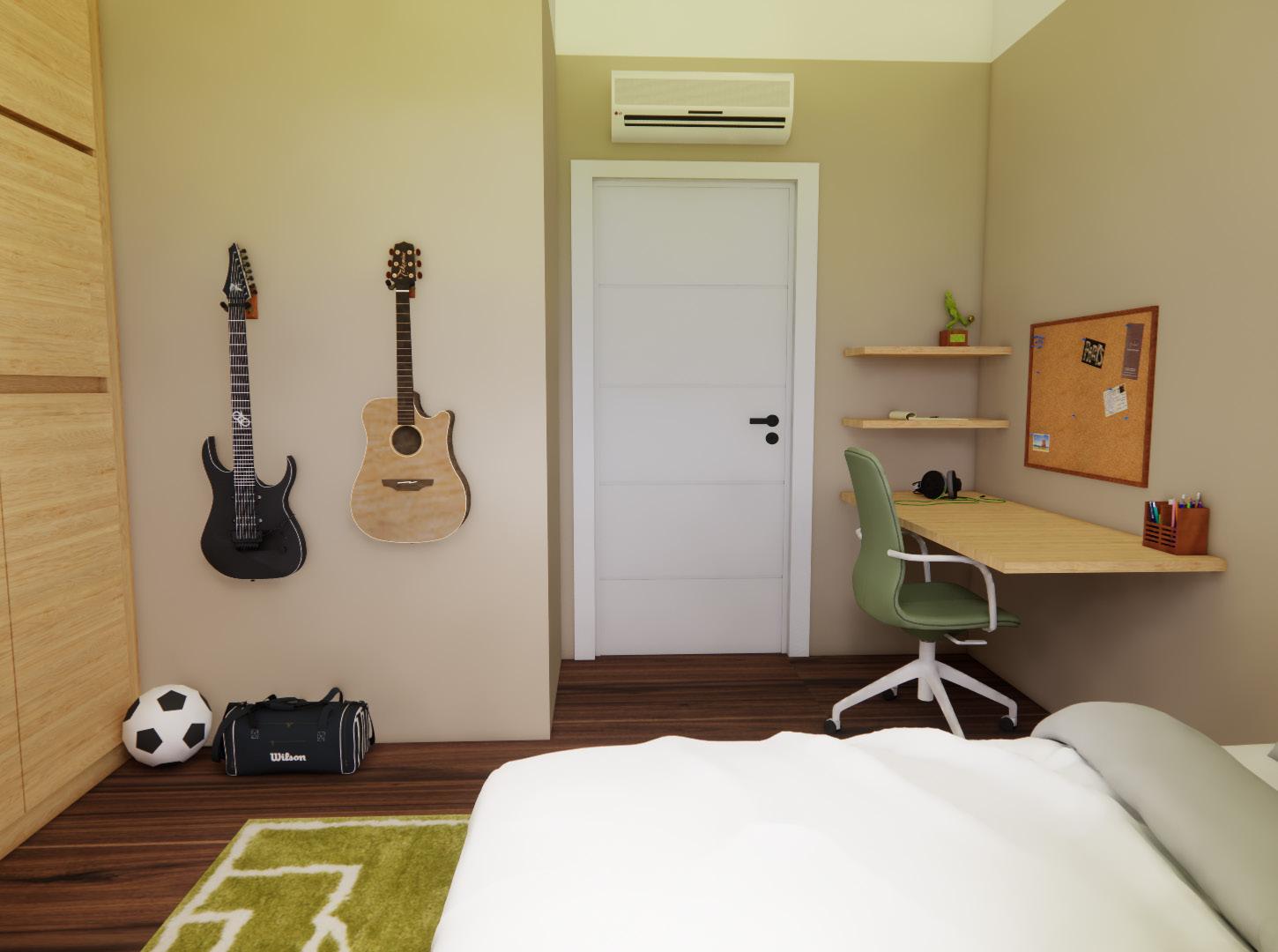 The boy’s bedroom contains a custom floor to ceiling buildin wardrobe. Upon request, Mateus’s room also contains space for him to do homework, store his soccer gear, and hang his guitars for when he is not playing music.