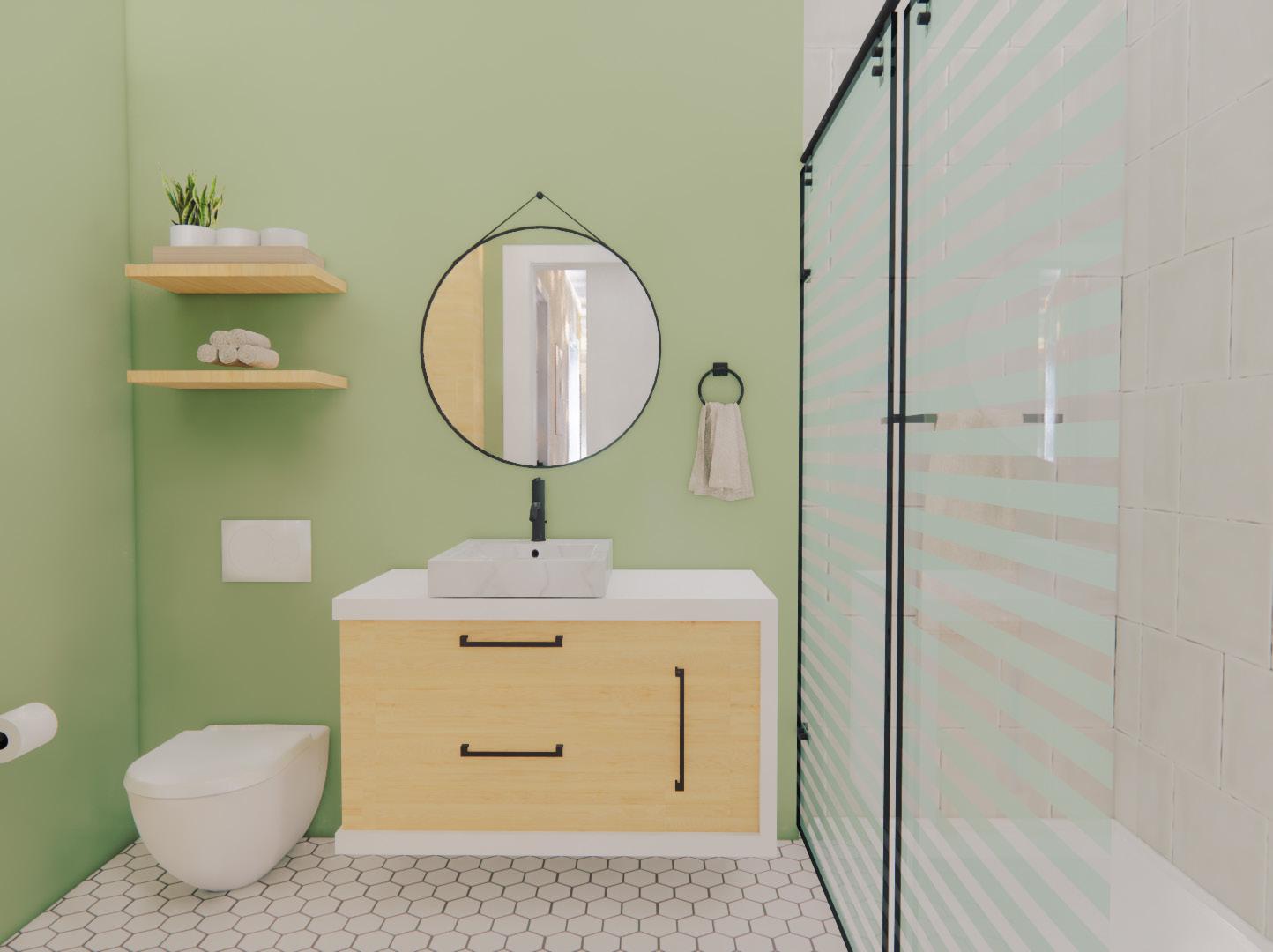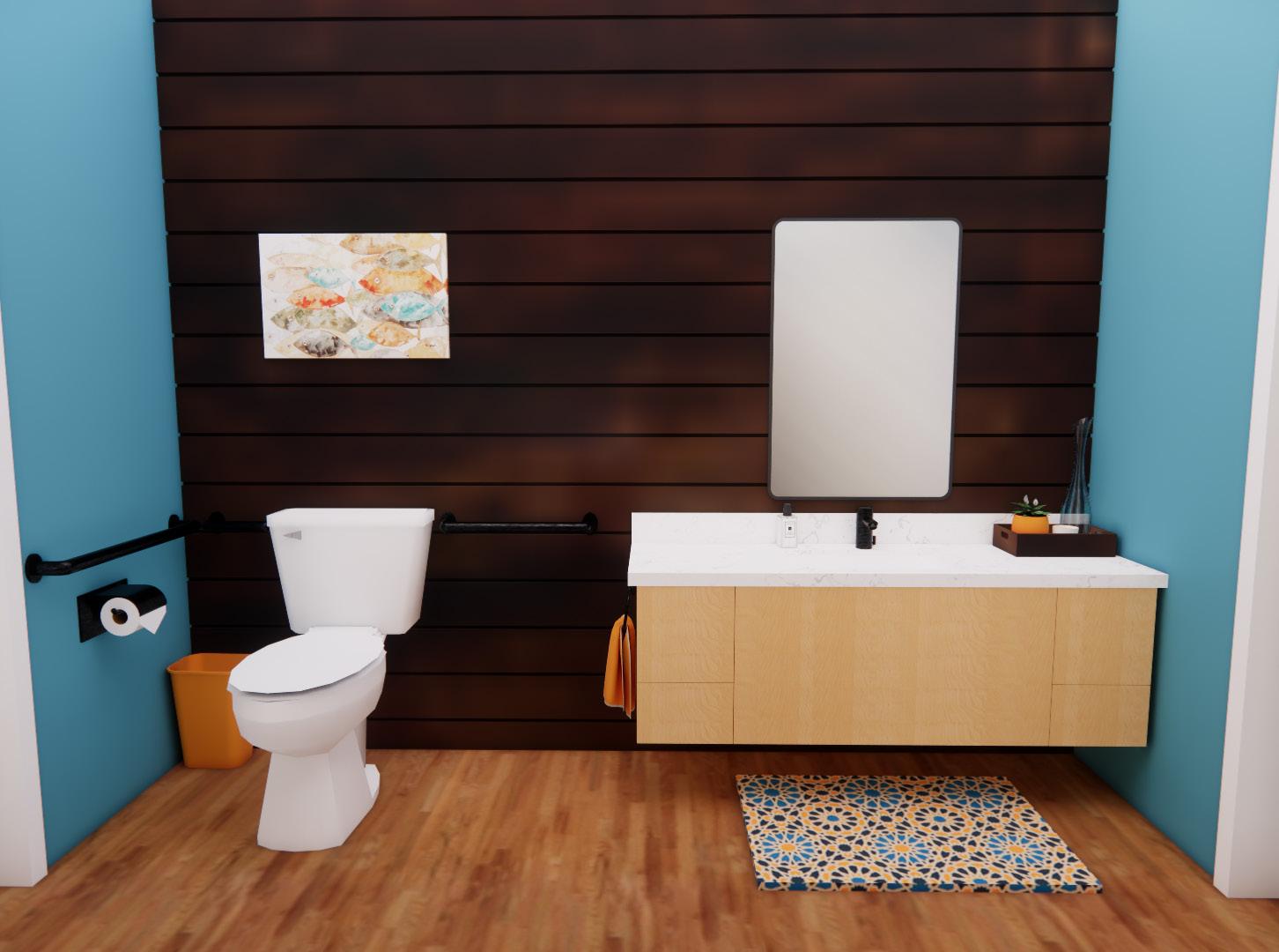 The secondary bathroom includes a wall mounted toilet and vanity, storage for toiletries, and a stand up shower rather than a bath tub. Having a wall mounted toilet and vanity provides a much more convenient way of cleaning. The design also includes a waterproof tile floor to help with the cleanliness of the space.