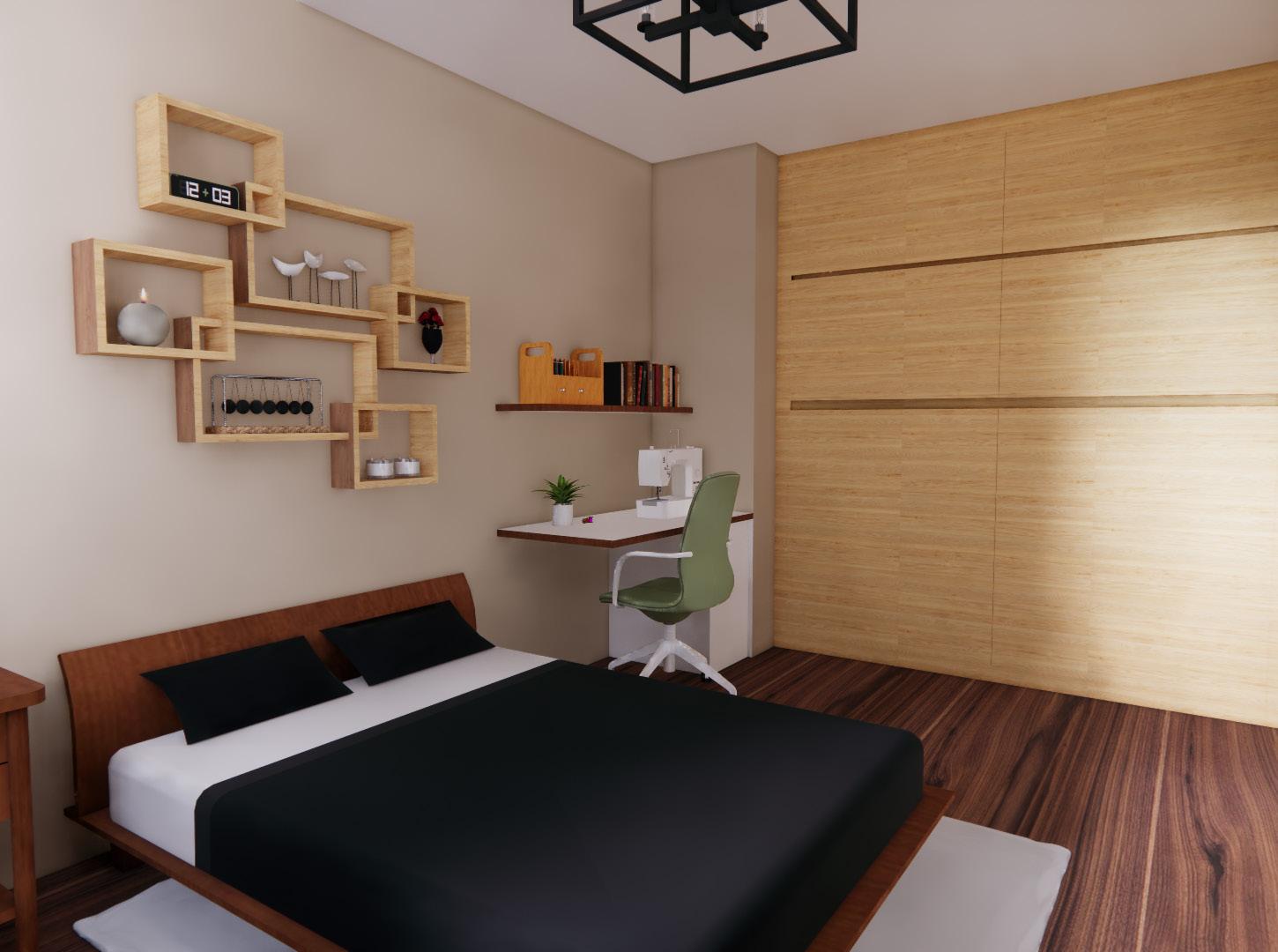 The master bedroom contains a large ceiling to floor built-in wardrobe along with neutral colors to follow the Brazilian culture. As requested, the space provides an area for sewing or to do business from home.