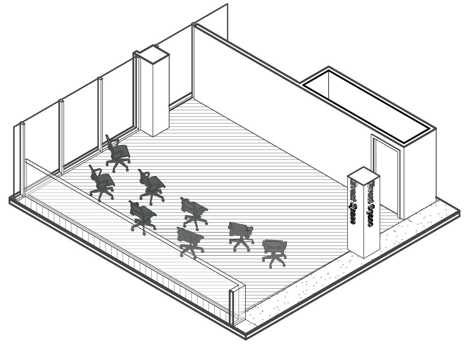 The gather and event space includes mobile furniture which can be arranged based on the event that is being hosted in the space. A closet is also attached to the gather and event space in order to house chairs or tables that are not being used for some events.