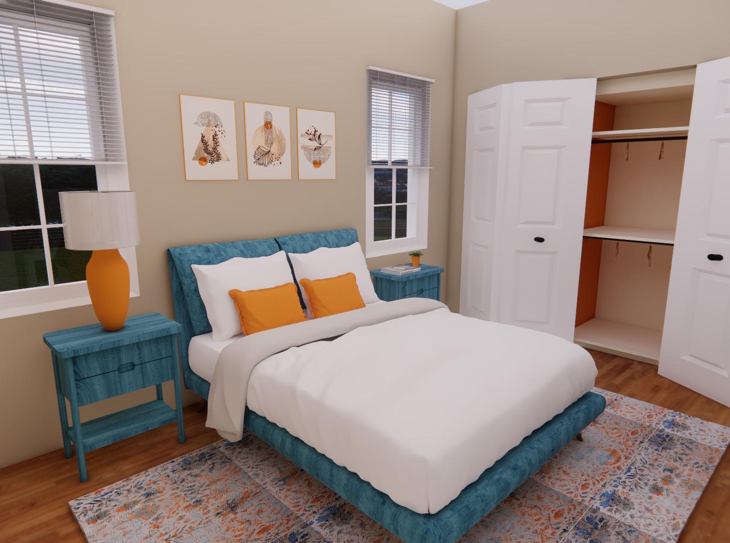 The bedroom contains a low pile rug which allows for mobility devices to roll over with easy and a closet with lower shelves to prevent having to reach.
