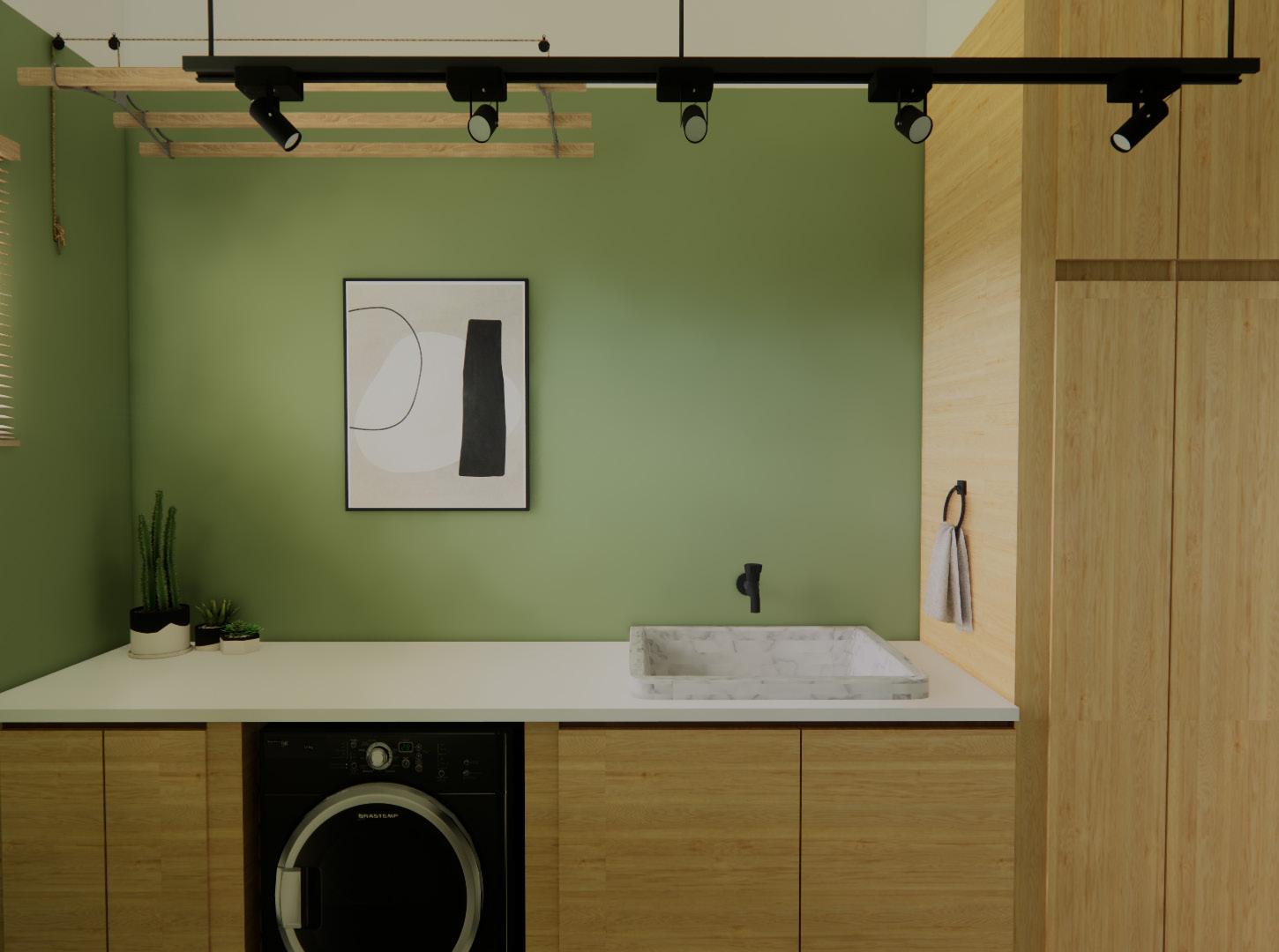 The laundry room contains custom build-in cabinets, a drying rack that is able to be raised or lowered, a tanque, or a large laundry sink, and a Brazilian washer and dryer combo appliance.