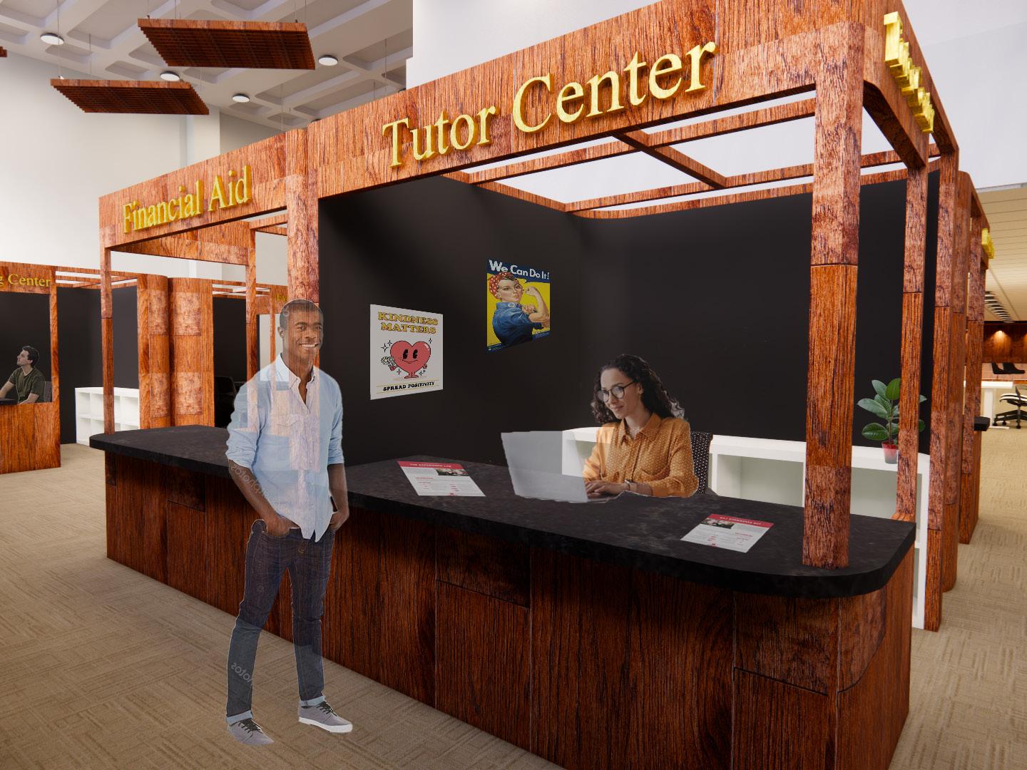 The academic support hubs contain storage for the employees along with plenty of counter space to display hand-outs for guests along with having enough space to do their own work. The academic support hubs are mostly enclosed to provide a welcoming environment while having an open ceiling to allow for natural and artificial light.