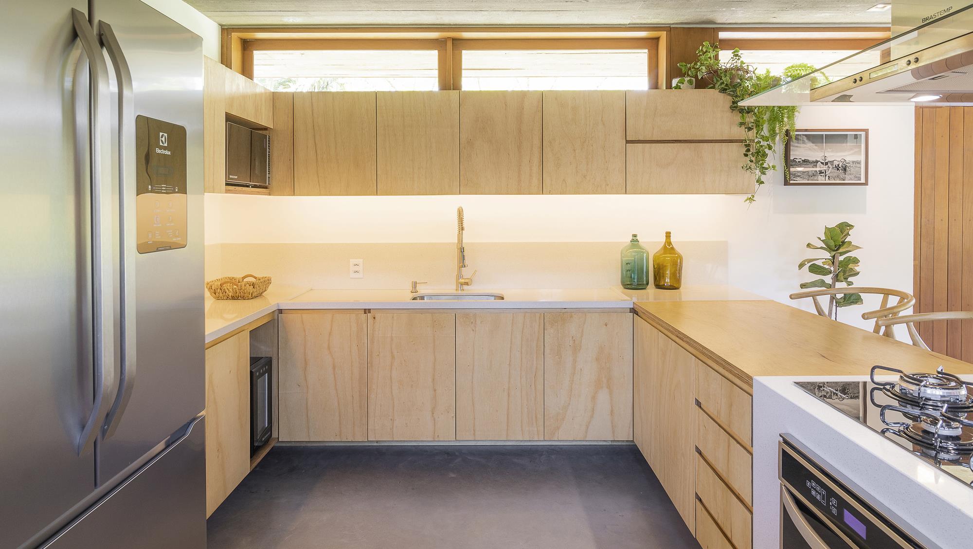 The kitchen contains custom build-in cabinets with finger grooves rather than knobs or pulls that go to the ceiling to allow for the most amount of possible storage. The kitchen also contains Brazilian appliances.