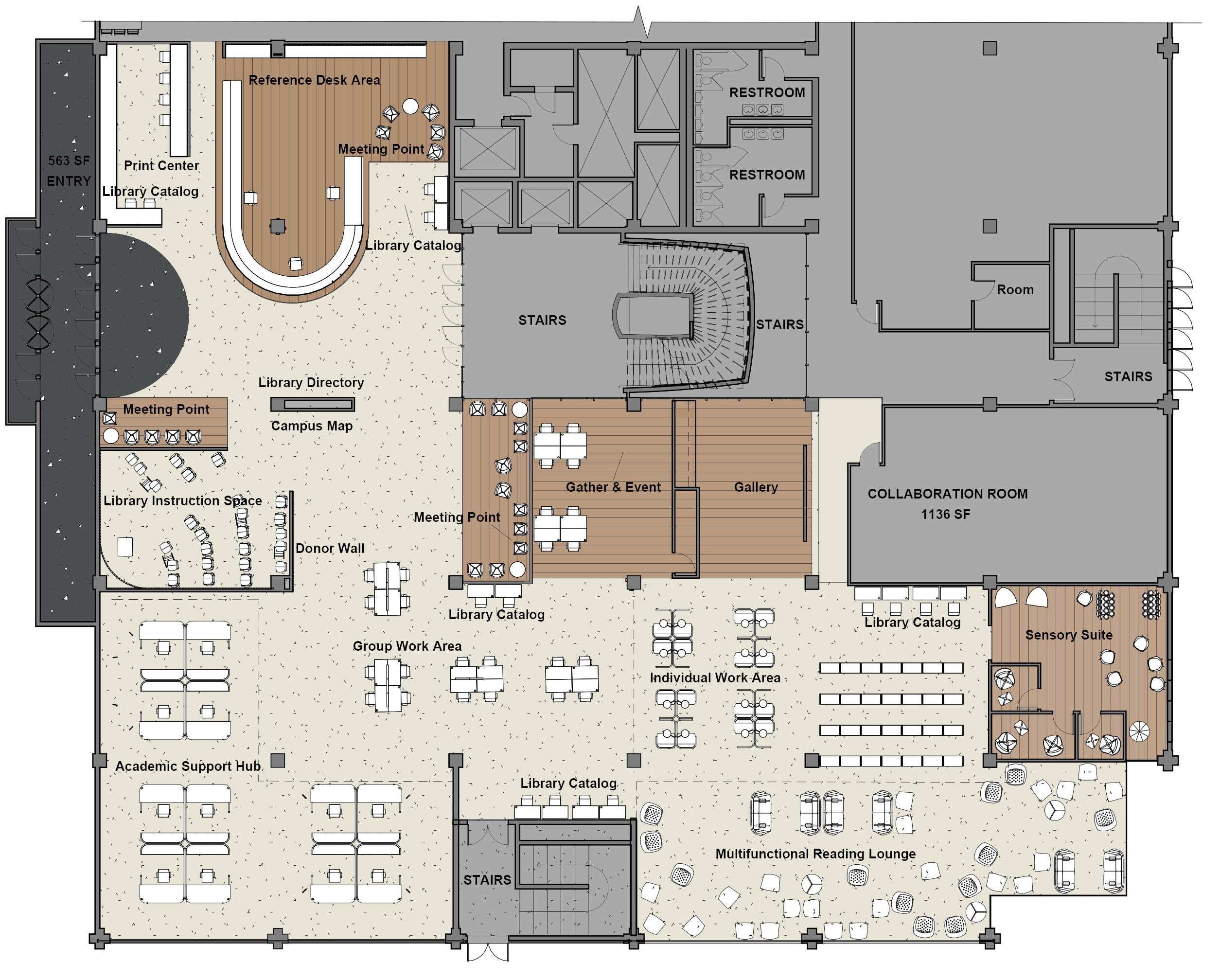 The floor plan consists of a reference desk, print center, library catalogs, meeting points, a library directory, a campus map, a library instruction space, a donor wall, academic support hubs, a group work area, an individual work area, gather and event space, a gallery, a sensory suite, and a multifunctional reading lounge.