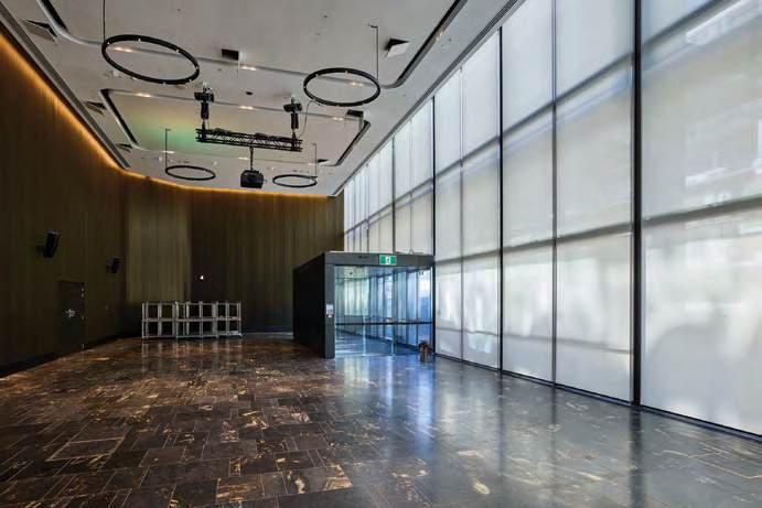 The theatre staging infrastructure is equally adaptable. Large freight elevators connect directly to the stage, and with the help of a pneumatic lift system, the stage can be deployed within 45 minutes, while the full theatre floor and retractable seating take approximately two hours. The lower-level seating is fully retractable, converting the space rapidly between seated, banquet, and open-floor configurations.