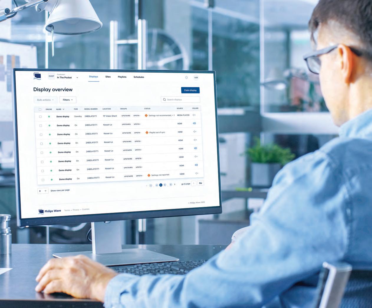 Integrating different types of hardware can be challenging, Sending service technicians is costly. And displays are not always accessible. Philips Wave puts you fully in control with simplified installation and display set-up, including managing, monitoring, and controlling displays, upgrading firmware, managing playlists, and setting power schedules. Allowing you to save time, energy and environmental impact.