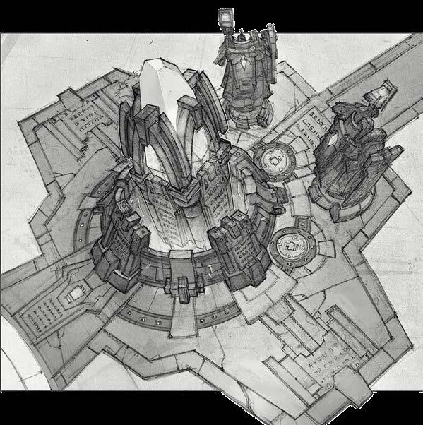 La tecnología hextech combina la pulcra geometría por capas de la arquitectura inspirada en el art déco con una influyente energía mágica que la hace parecer moderna y fantástica al mismo tiempo.