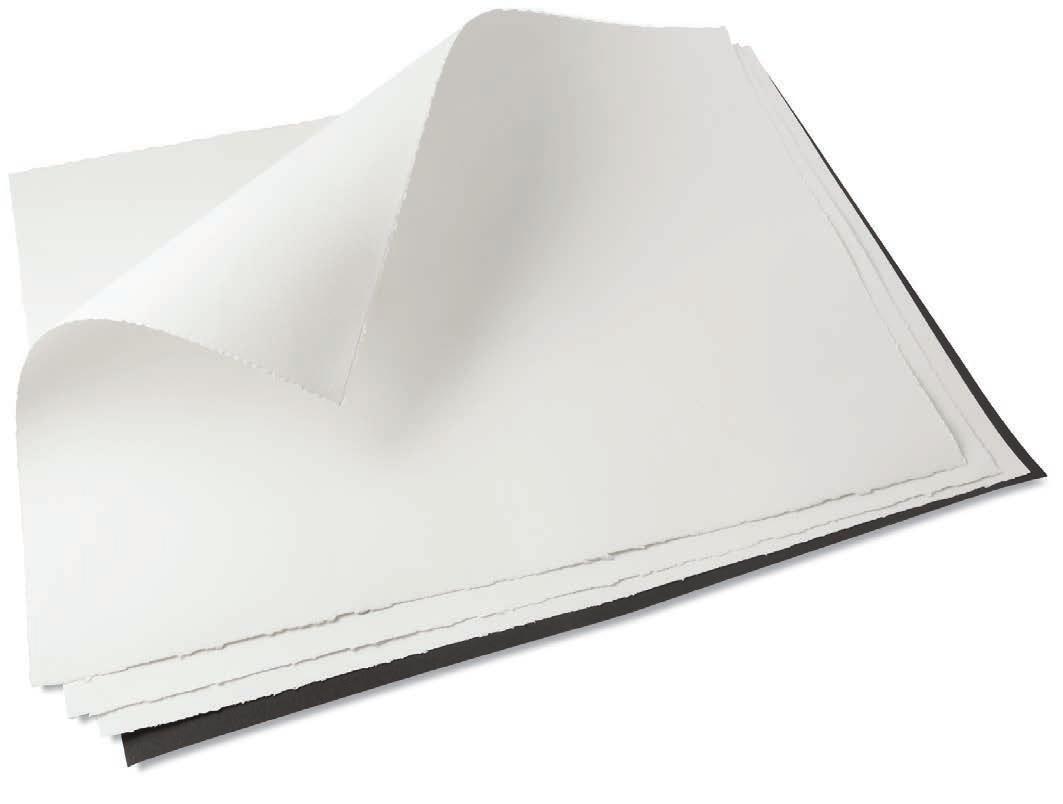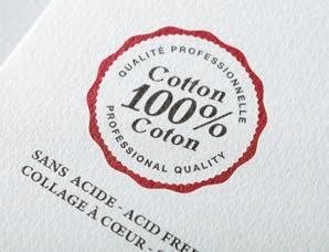 100 % coton • Fabriqué sans acide (pH neutre) ni azurant optique sur machine à forme ronde. La pureté de l’eau et du coton entrant dans la composition de la pâte à papier, la qualité et l’homogénéité de son collage à cœur et en surface adapté aux pigments modernes, son procédé de fabrication quasi artisanal font de lui un papier unique.
