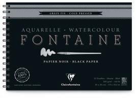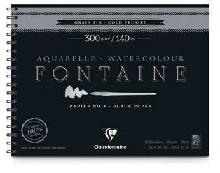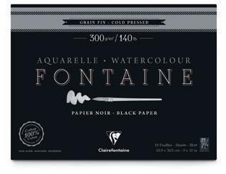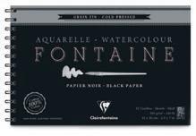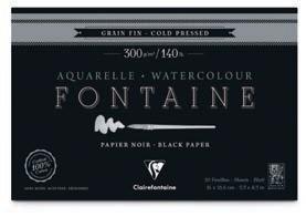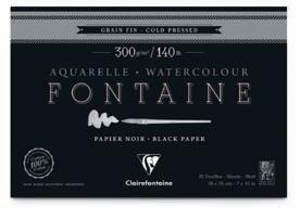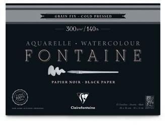 papier aquarelle Fontaine noir - 300 g/m2 Grain fin • 100 % coton • Teinté dans la masse. Pour les artistes souhaitant donner une belle profondeur à leurs créations grâce à un support très foncé. Teinté dans la masse, il est idéal pour les couleurs couvrantes aux nuances claires, irisées ou encore métallisées et qui