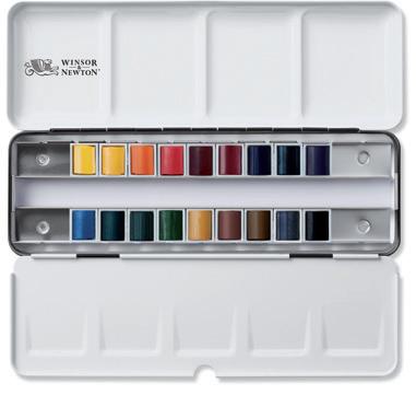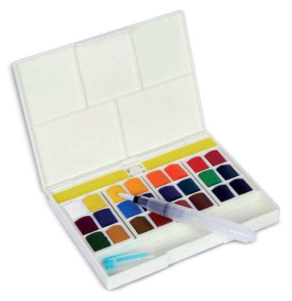 Complete set Inhoud : 12 1/2 napjes fijne aquarelverf, 1 penseel met reservoir en 1 scharnierarm.