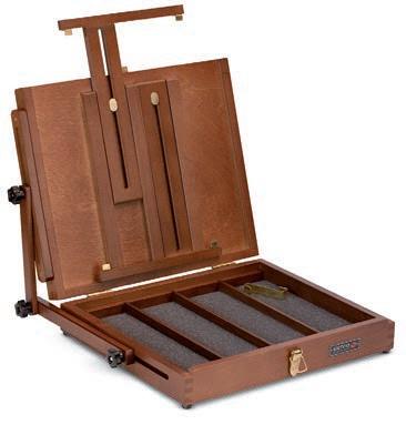 • Plateau d’accessoires : 26,35 x 19,36 x 1,27 cm. Quatre grands compartiments de rangement doublés d’une couche de mousse amovible. Il s’agit également d’un chevalet qui vous permettra de saisir toutes les inspirations en plein air. Porte-support pour une parfaite stabilité de votre feuille Pastelmat, Pastelcard ou Uart lors de votre réalisation. Plateau d’accessoires qui se range au dos du couvercle avec des aimants. Il se fixe sur le côté droit de la boîte pendant l’utilisation. Livré sans trépied. Prix par co ret.