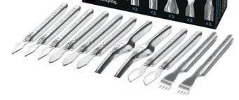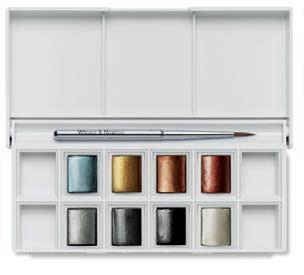 Contenu : 16 godets métalliques taille S (1,5 x 1,5 cm), 8 godets métalliques taille M (1,5 x 3 cm), 4 godets métalliques taille L (3 x 3 cm) et 6 palettes de mélange en métal laqué blanc (3 x 6 cm). Dimensions boîte fermée : 9,5 x 12 x 1,3 cm. Prix à l’unité.