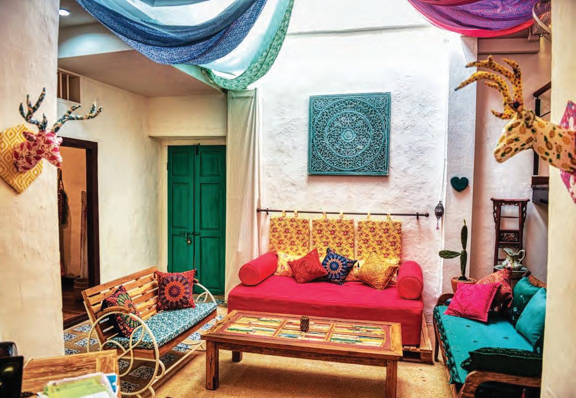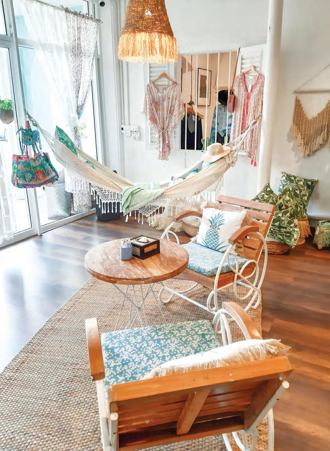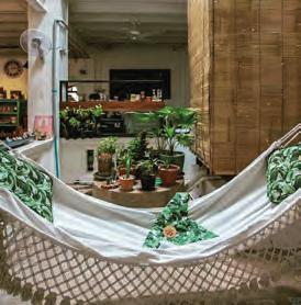 de bains spacieuse équipée d’une baignoire en forme de hamac. Les plafonds élevés sont décorés dans un style européen Shabby Chic, avec des matériaux recyclés et une palette de couleurs sélectionnée dans la jungle et la mer.