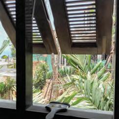 The upper floor, giving the feeling of floating over the leaf canopy houses the luxurious air-conditioned bedroom with a grand kingsized bed, flat-screen TV, balcony with views of the Bay, and spacious bathroom with a unique hammock-shaped bath. High ceilings are all