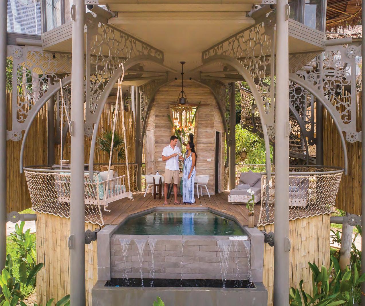 Enter the signature TreeHouse Villa over a suspension bridge, where downstairs you’ll find the spacious outdoor deck area with a private plunge pool, dining area, sun beds and stand-up bar with a mini-fridge and mini wine cooler. Guests can make direct and customized requests for in-villa dining, spa treatments, yoga sessions.