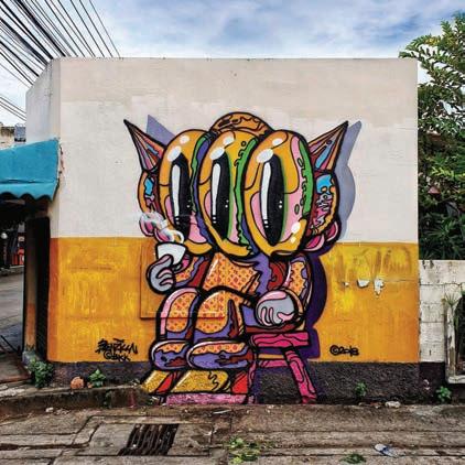 In 2016, the Bukruk urban arts festival bequeathed the neighborhood with a series of painted walls that form a journey in themselves. From Dutch artist Daan Botlek’s monumental work at the foot of the Saphan Taksin BTS station to frescoes by Thai graffiti artists Alex Face, Lolay, BonusTMC and French artist Thibaud Tchertchian Soi 32, from Italian duo Sten & Lex’s monochrome Soi 30 to Charoen Krung Soi 28, where the walls have been taken over by Thai artist MueBon, Romanian Saddo and Korean Daehyun Kim.